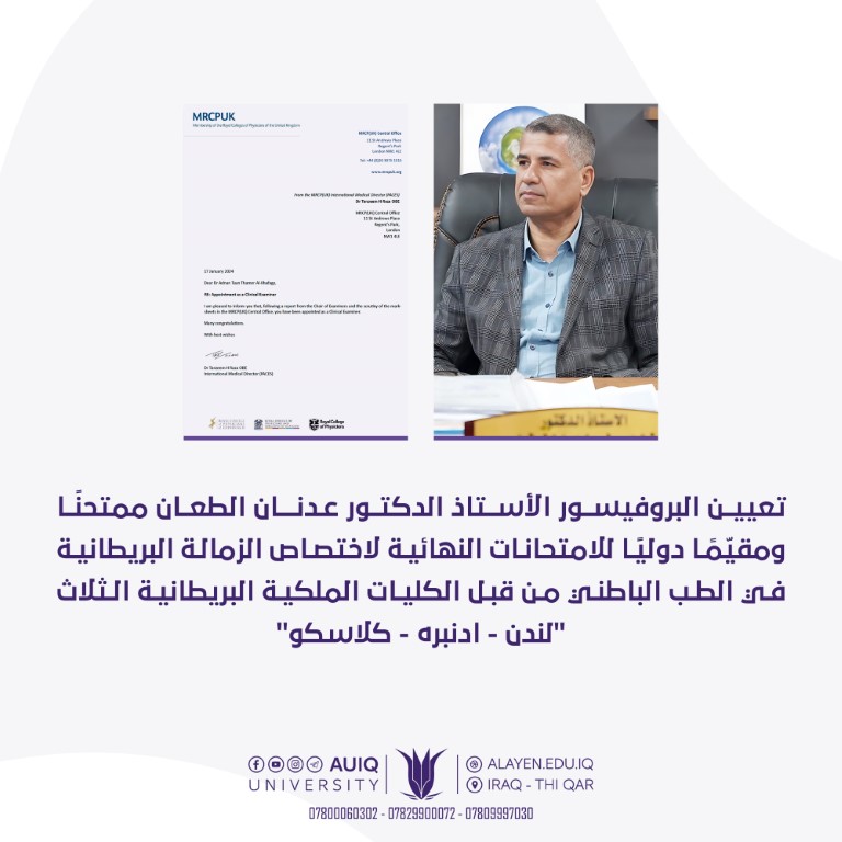 أصدرت الإدارة العامة للكليات الملكية البريطانية في لندن يوم السابع عشر من كانون الثاني ٢٠٢٤ أمرا إداريا يقضي بتعيين البروفيسور عدنان طعان ثامر الخفاجي عميد كلية الطب جامعة العين العراقية اختصاص دقيق أمراض القلب والتداخل القسطاري تعيينه ممتحننا وفاحصا دوليا لامتحانات الزمالة البريطانية النهائية.