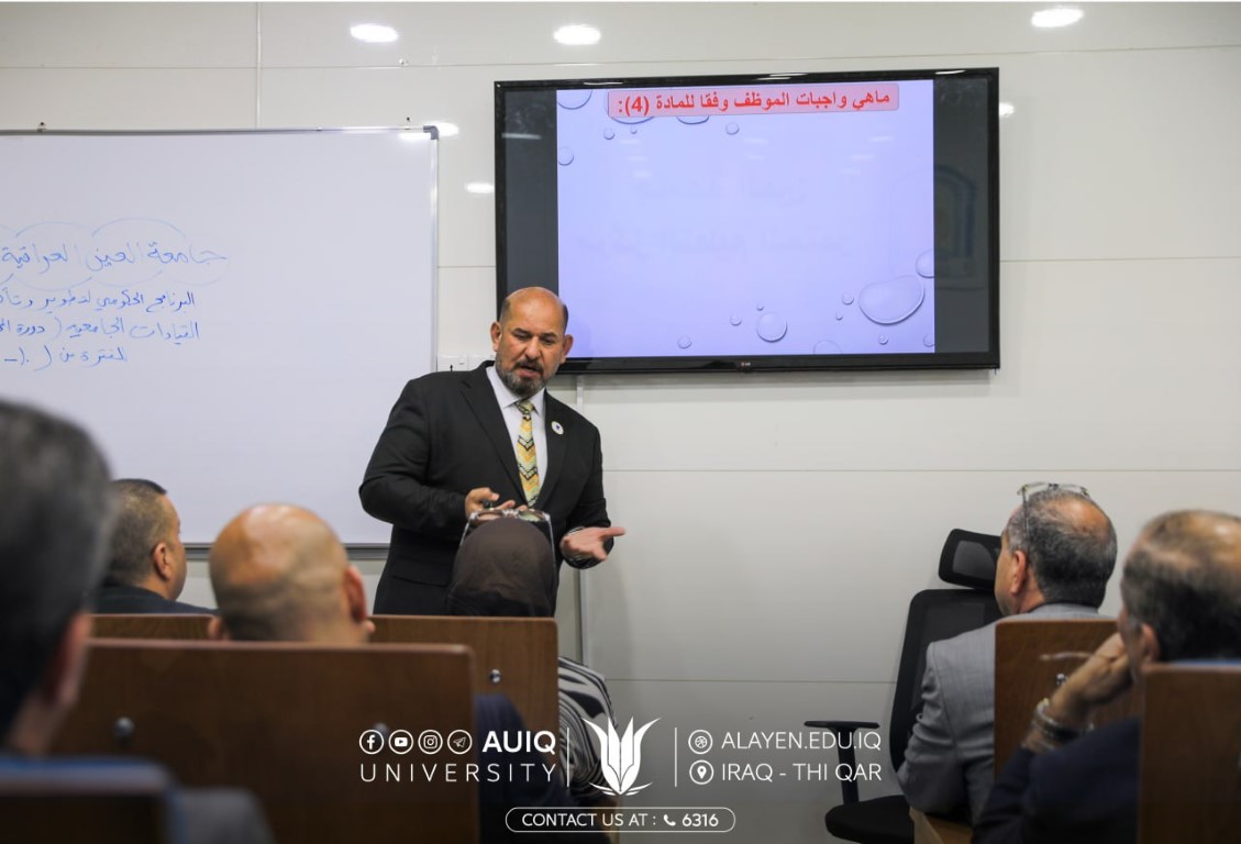 في خطوة تعزز دورها في تطوير القطاع التعليمي، نظمت كلية القانون / جامعة العين العراقية دورة تدريبية متخصصة حول قانون انضباط موظفي الدولة والقطاع العام (رقم ١٤ لسنة ١٩٩١ المعدلة)، بتاريخ 10/03/2024 بقيادة عميد كلية القانون في الجامعة الاستاذ الدكتور خالد كاظم الابراهيمي