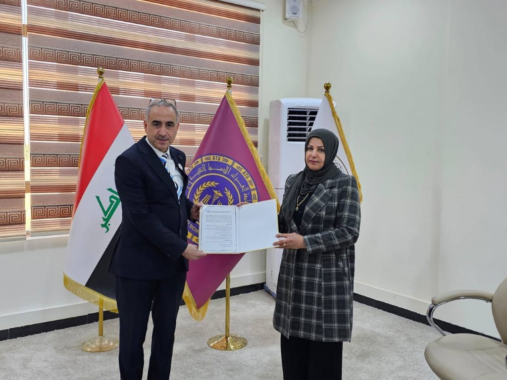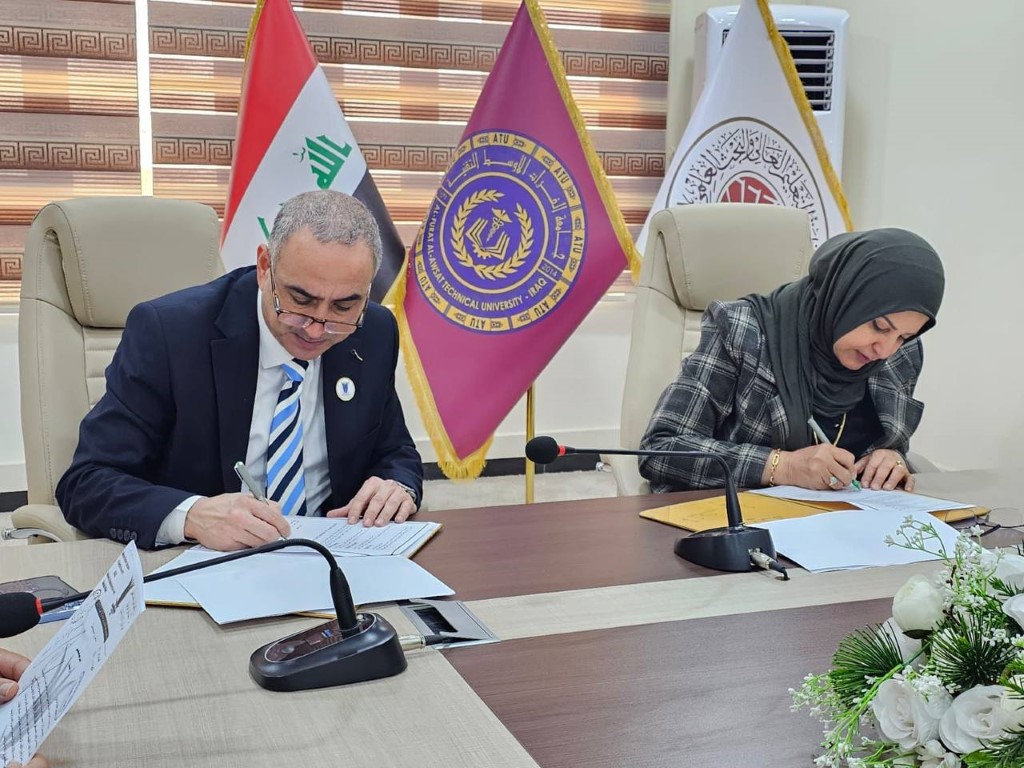 وقع عميد كلية التقنيات الصحية والطبية الاستاذ الدكتور محمد عبد الرضا الطحان مع الاستاذ الدكتورة انغام جاسم الرماحي عميد كلية التقنيات الصحية والطبية في جامعة الفرات الاوسط في الكوفة اتفاقية توأمة وتعاون علمي مشترك.
