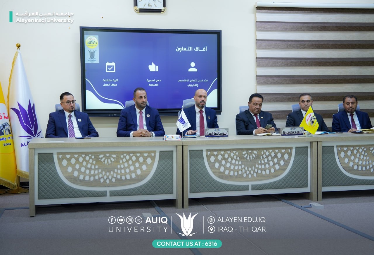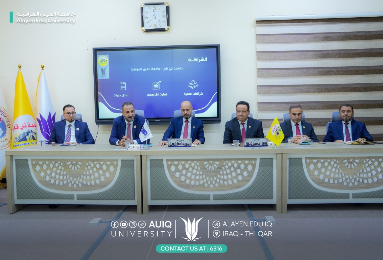 وجرت مراسم توقيع الاتفاقية خلال زيارة وفد جامعة العين العراقية برئاسة الأستاذ الدكتور حيدر عبد الأمير مرهون رئيس الجامعة، إلىجامعة ذي قار، حيث كان في استقباله الأستاذ الدكتور كمال حامد الياسري رئيس جامعة ذي قار وأعضاء مجلس الجامعة، وبحضور مجلسي الجامعتين