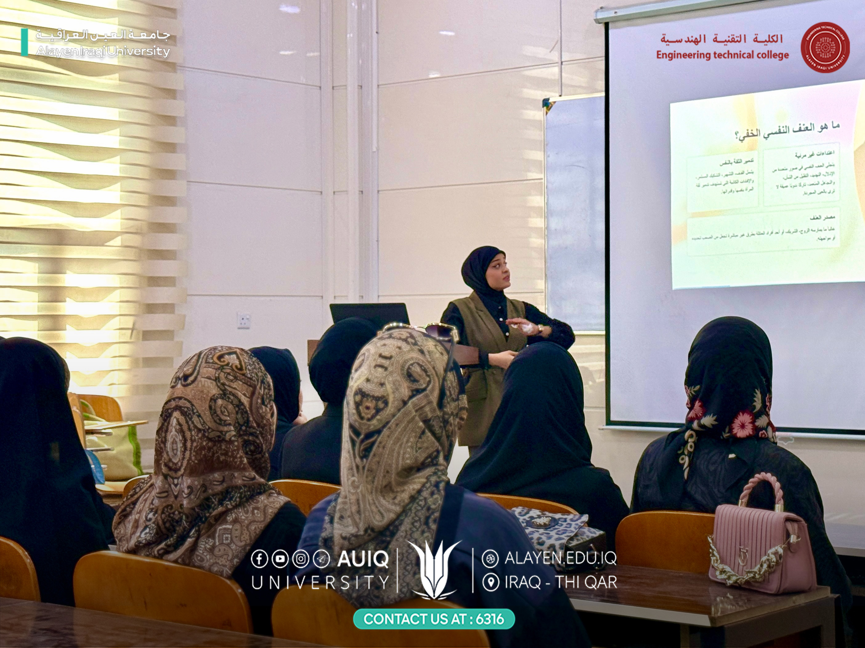 أقامت الكلية التقنية الهندسية ورشة توعوية بعنوان " النفسي الخفي بين مفاهيم العدالة وحقوق الانسان : نحو تعزيز قيم السلام والتسامح ومقاومة الطرف ”، قدّمتها م.م. أديان لطيف، وبمشاركة مجموعة من التدريسيين والطلبة.