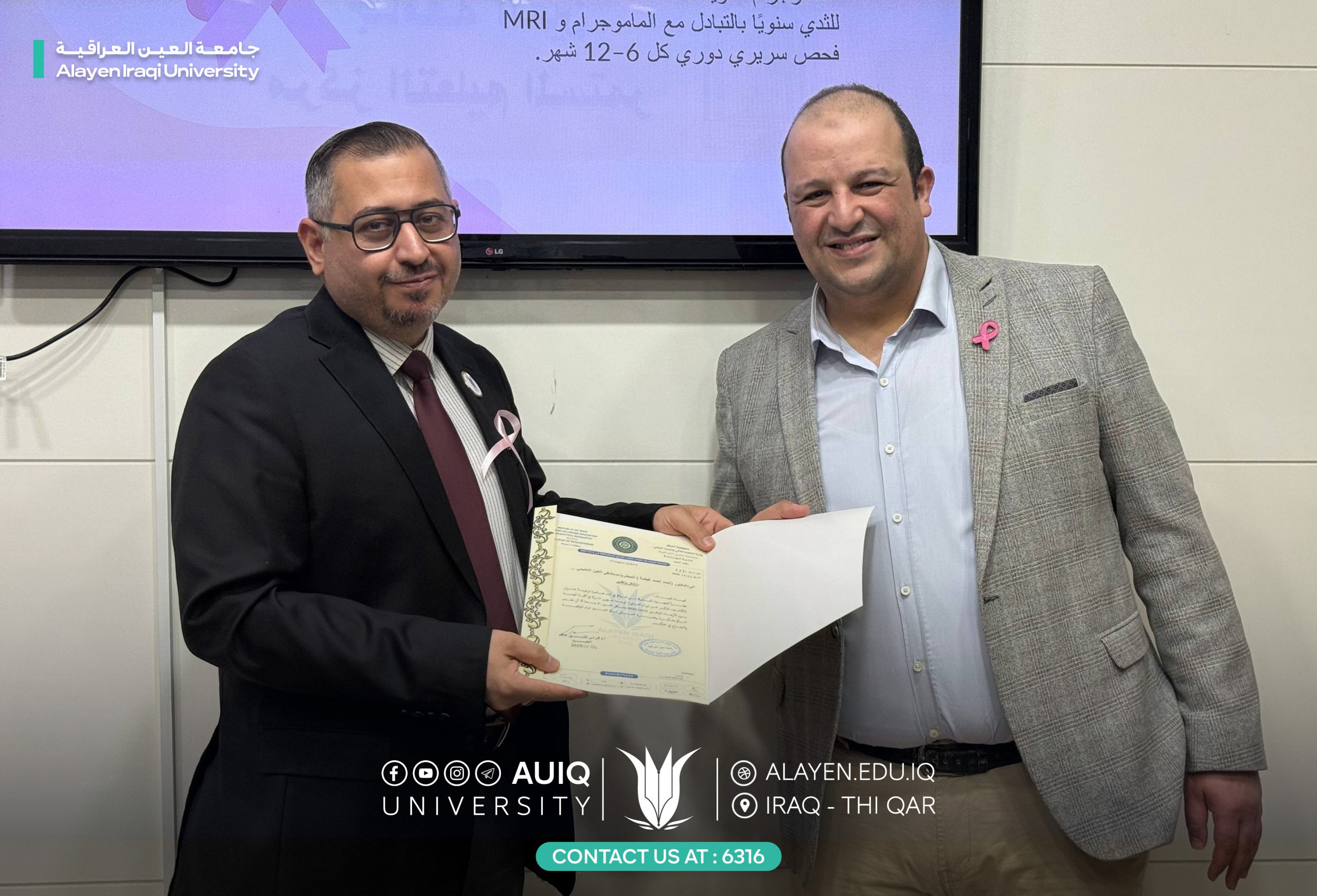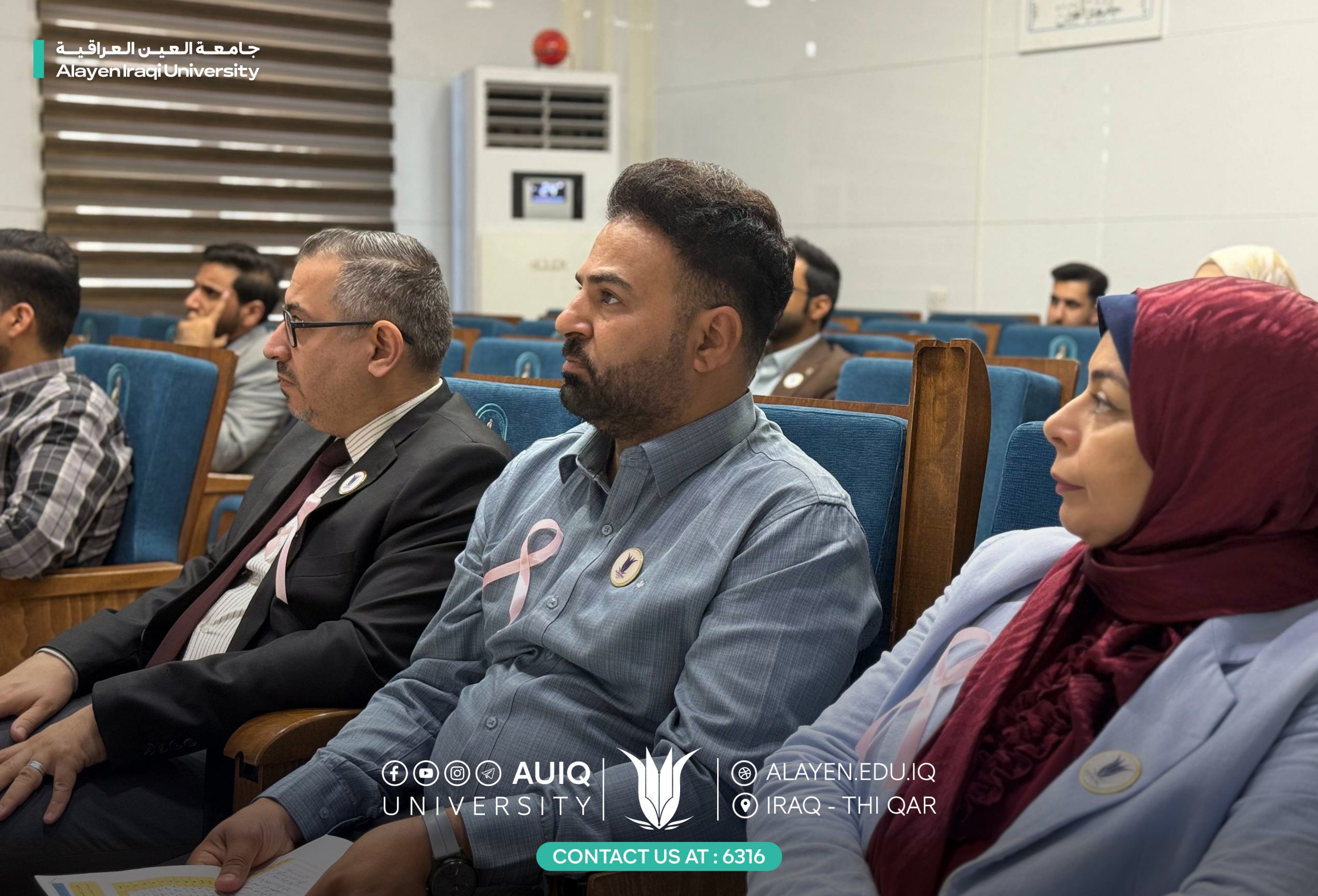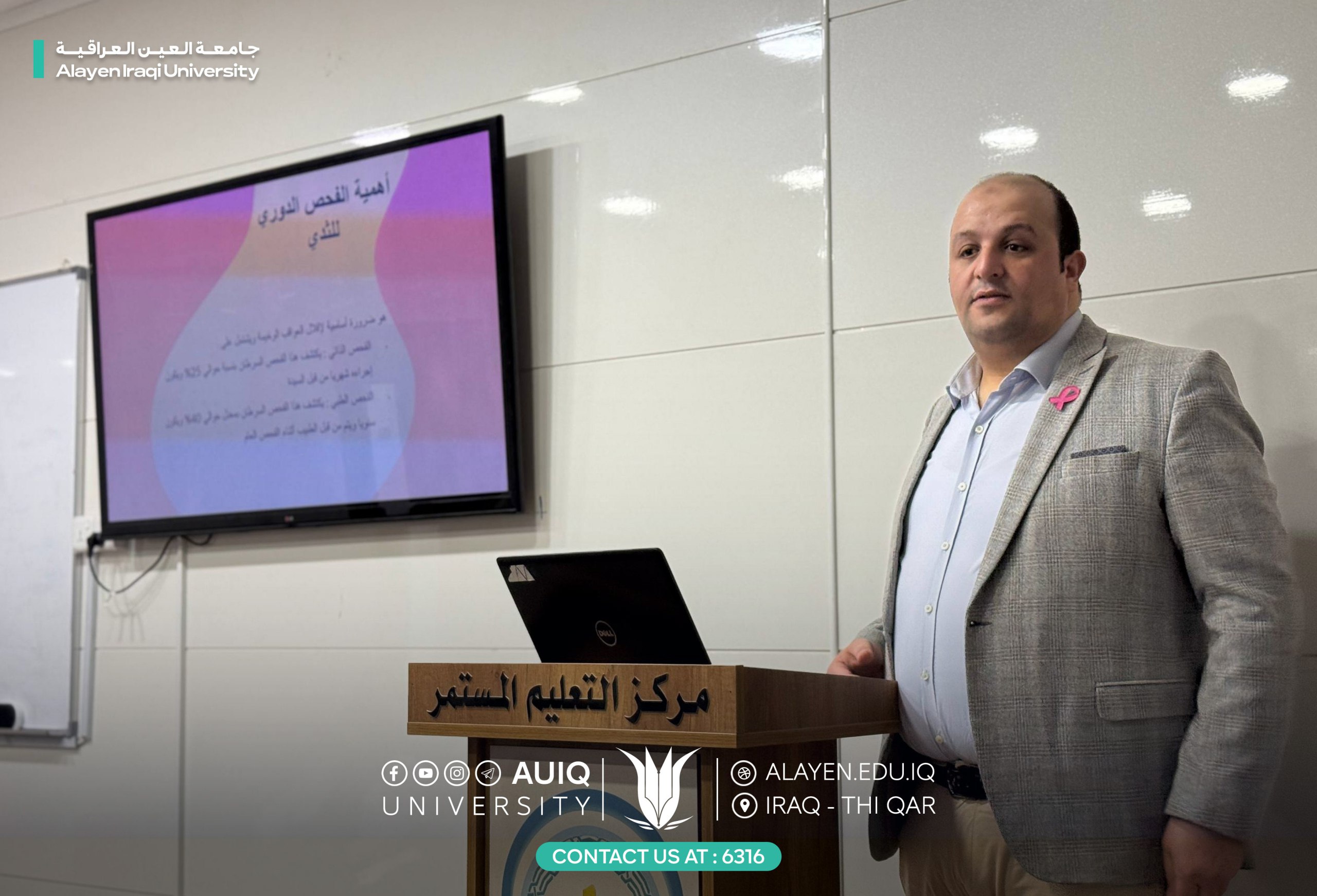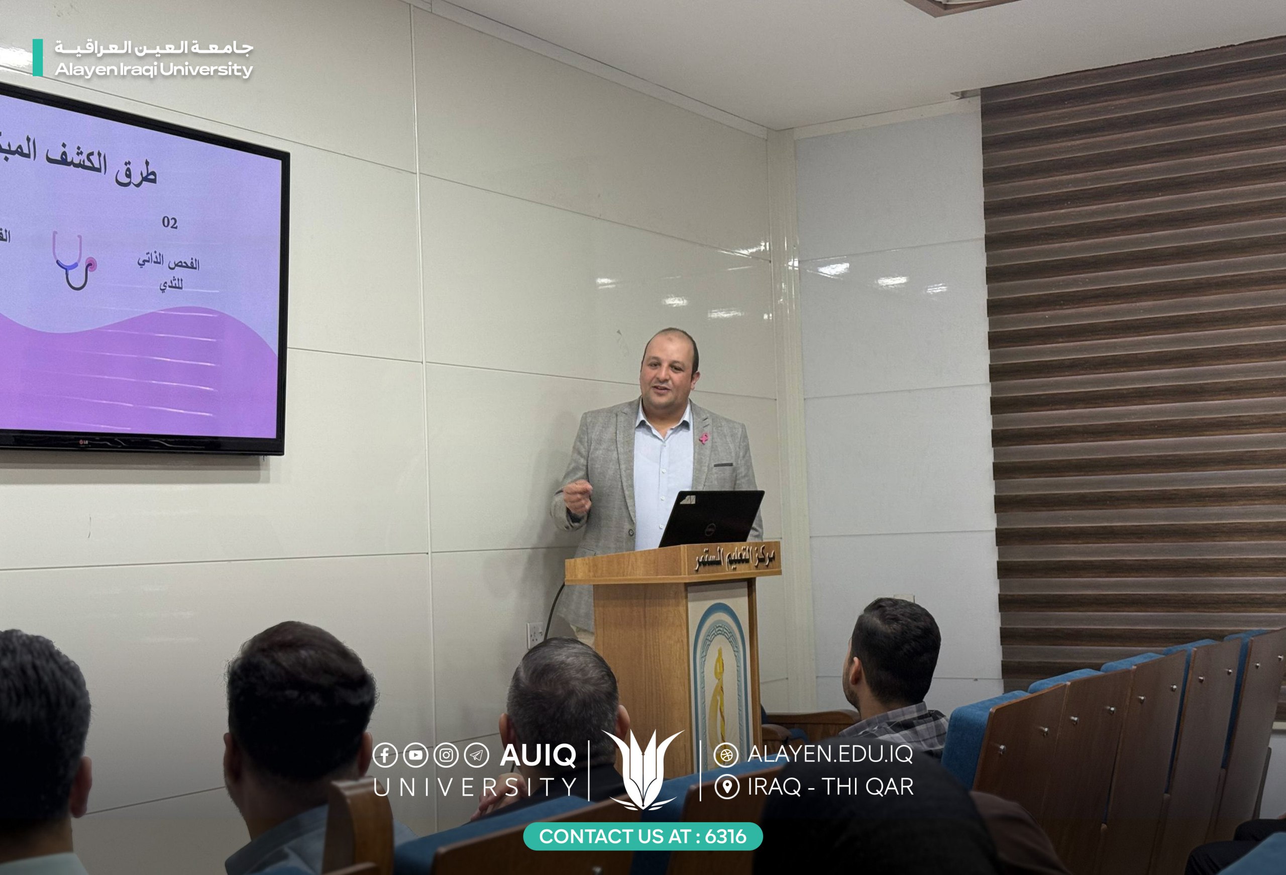 أقامت كلية الهندسة في جامعة العين العراقية، بالتعاون مع مستشفى العين التعليمي، محاضرة توعوية بعنوان “الكشف المبكر عن أورام الثدي”، قدّمها الدكتور أحمد أحمد غيضة من مستشفى العين التعليمي.