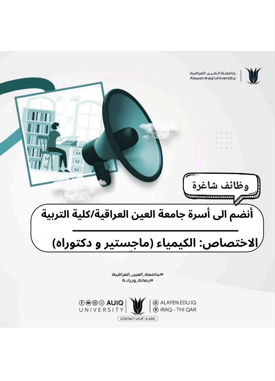 تعلن كلية التربية – جامعة العين العراقية عن حاجتها إلى تدريسيين من حملة شهادة الماجستير والدكتوراه للعمل ضمن ملاكها التدريسي للعام الدراسي الحالي، لاختصاص الكيمياء فقط .ان لا يكون المتقدم متعين بجهة حكومية او أهلية اخرى
