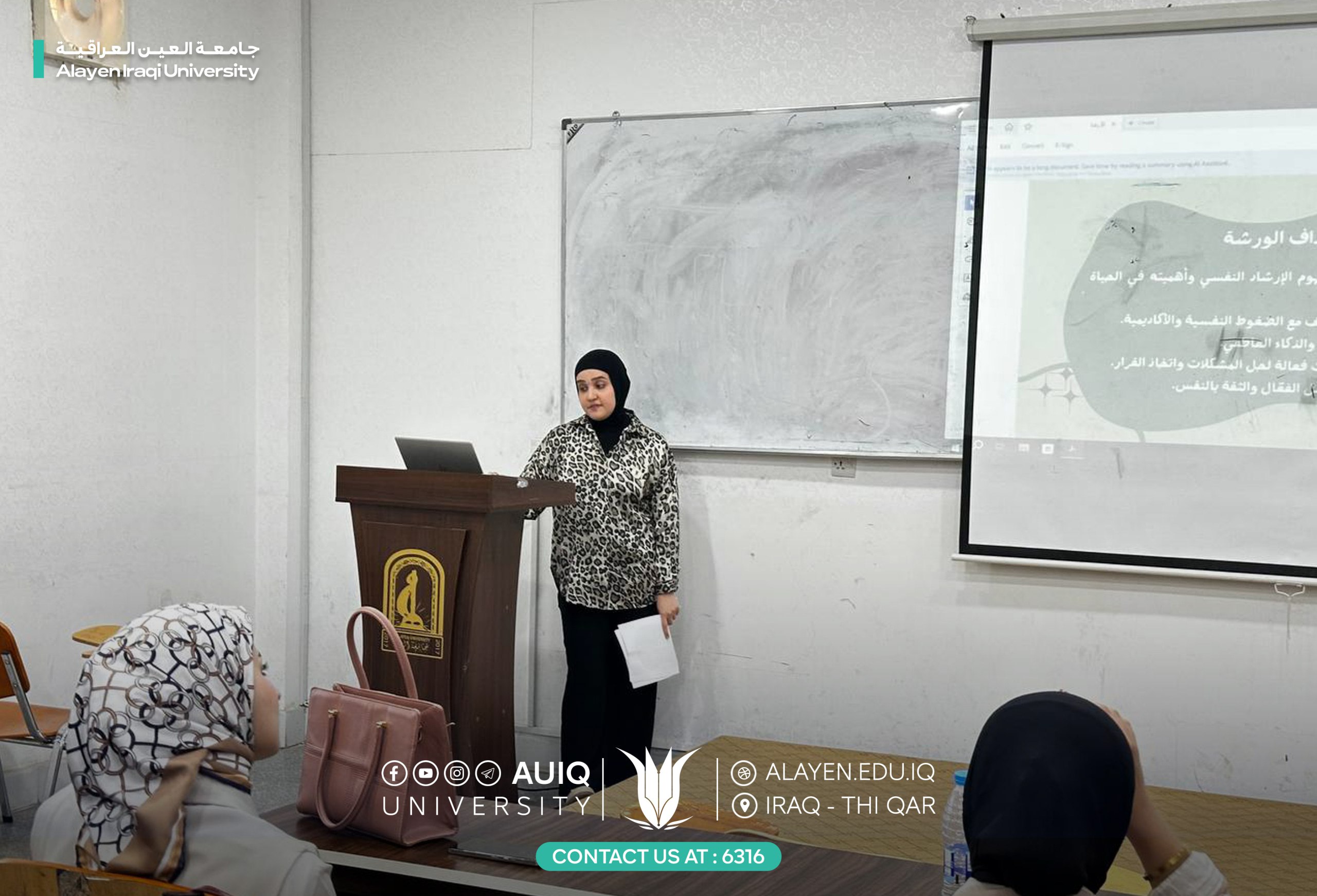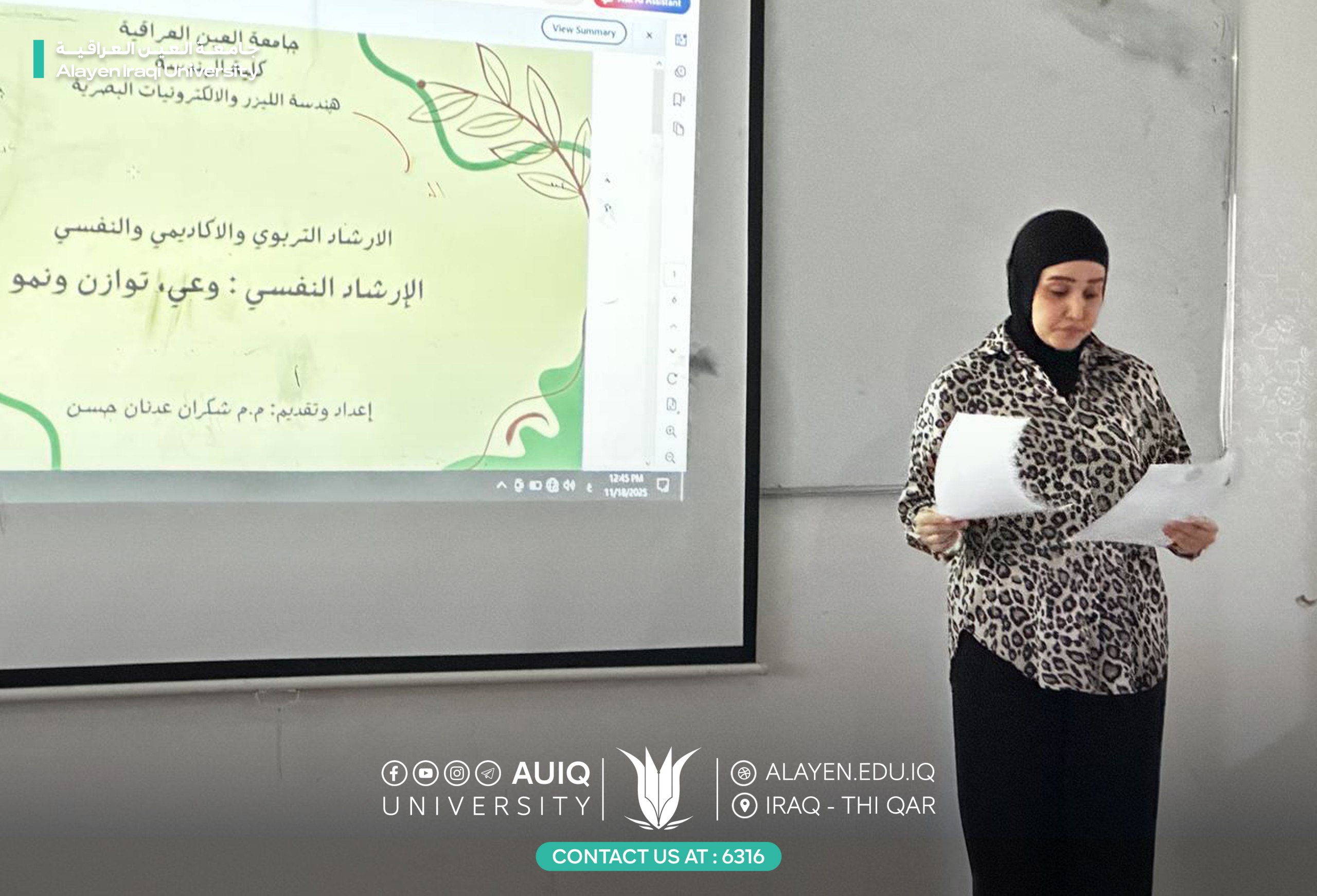 أقام قسم هندسة الليزر والإلكترونيات البصرية في كلية الهندسة بجامعة العين العراقية ورشة إرشادية بعنوان "الإرشاد الأكاديمي ودوره في بناء شخصية الطالب الجامعي المتوازنة"، قدمتها التدريسية م.م شكران عدنان حسن.