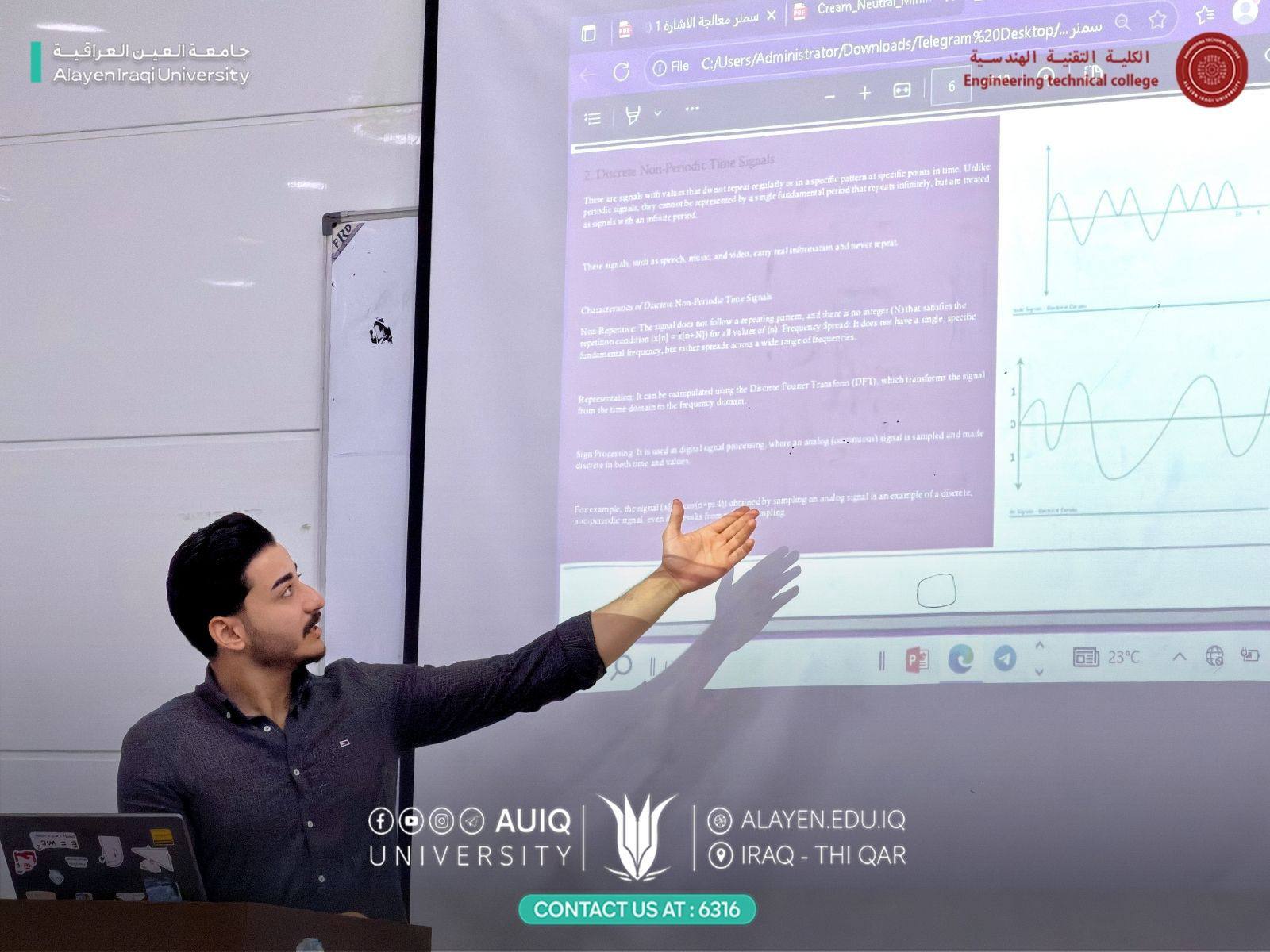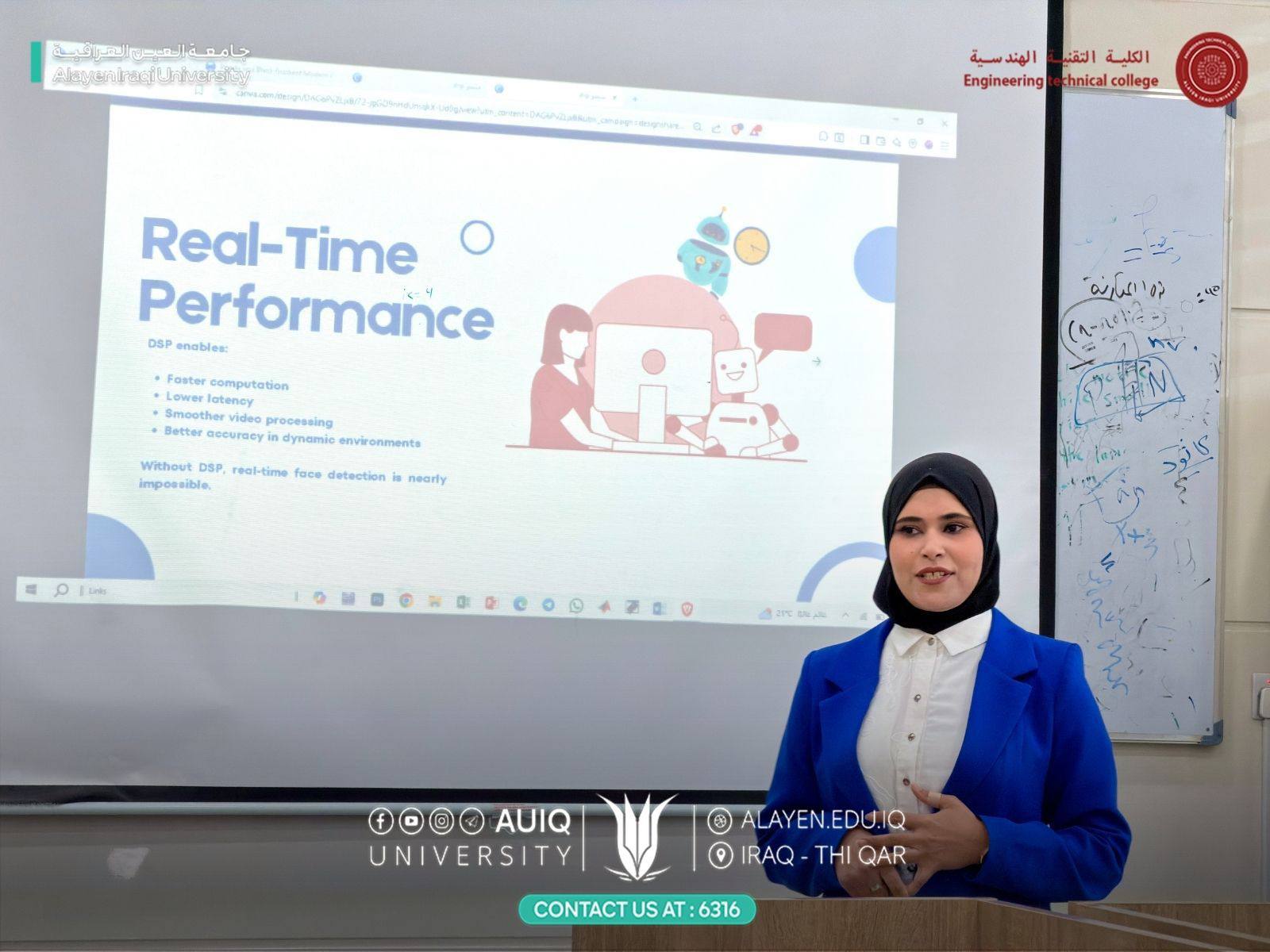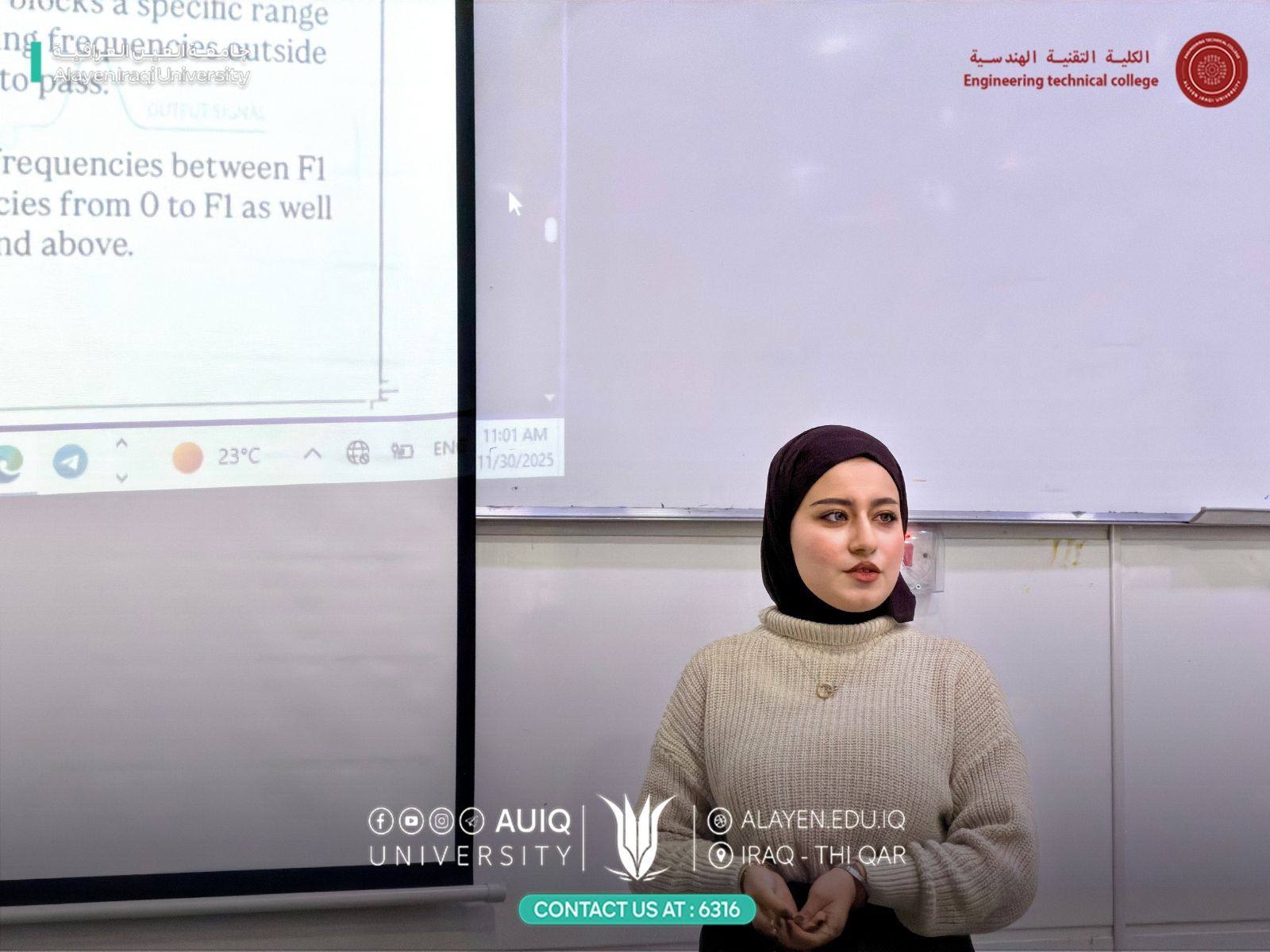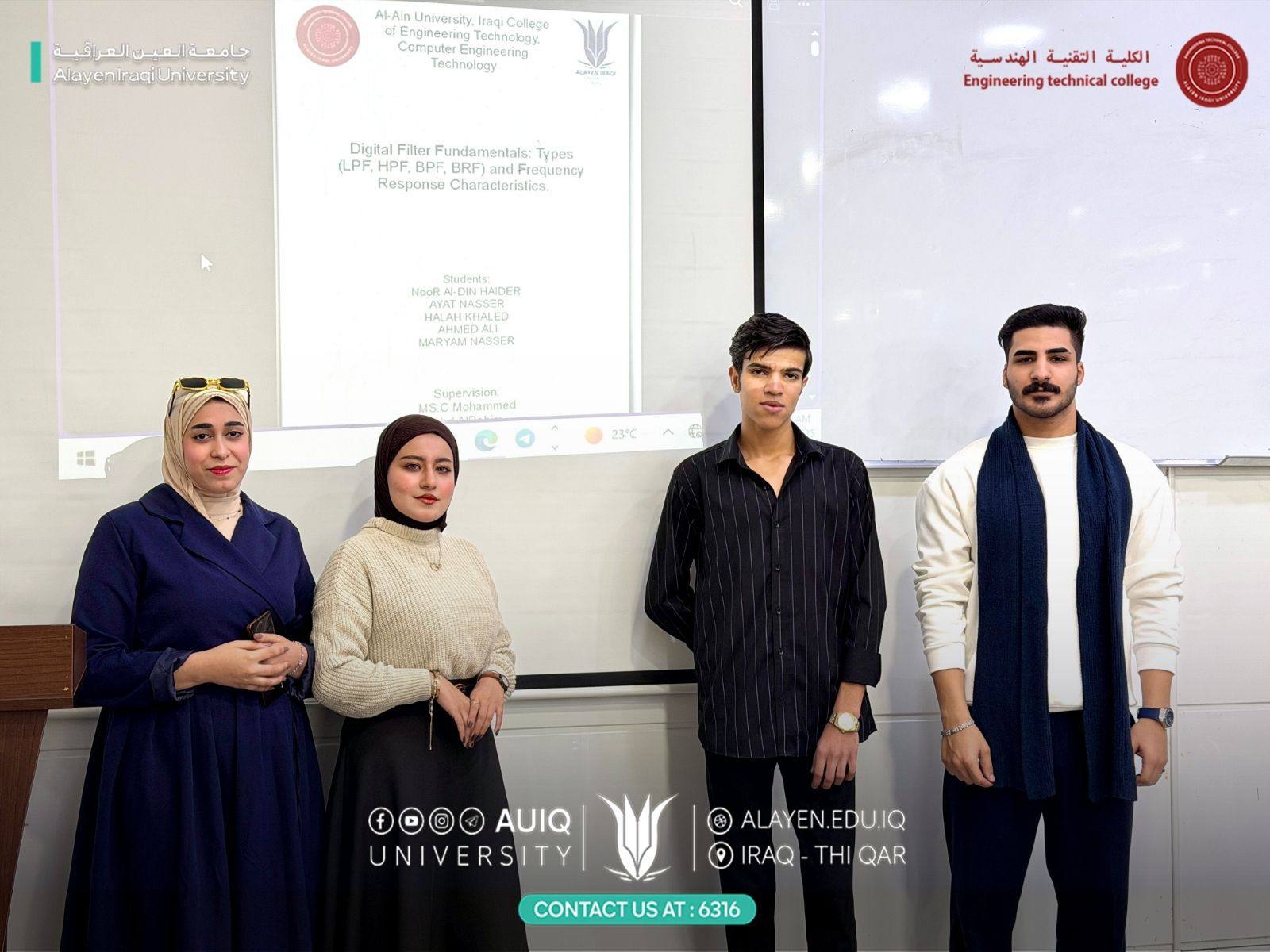 قدّم طلبة المرحلة الثالثة في قسم هندسة تقنيات الحاسوب جانباً من مشاركاتهم ضمن مادة معالجة الإشارة الرقمية (DSP)، وذلك من خلال شرح المفاهيم الأساسية للمادة وتقديم عروض توضيحية تناولت أهم المحاور النظرية المرتبطة بتحليل الإشارات، أنواع الفلاتر، وآليات تحويل الإشارات الرقمية.