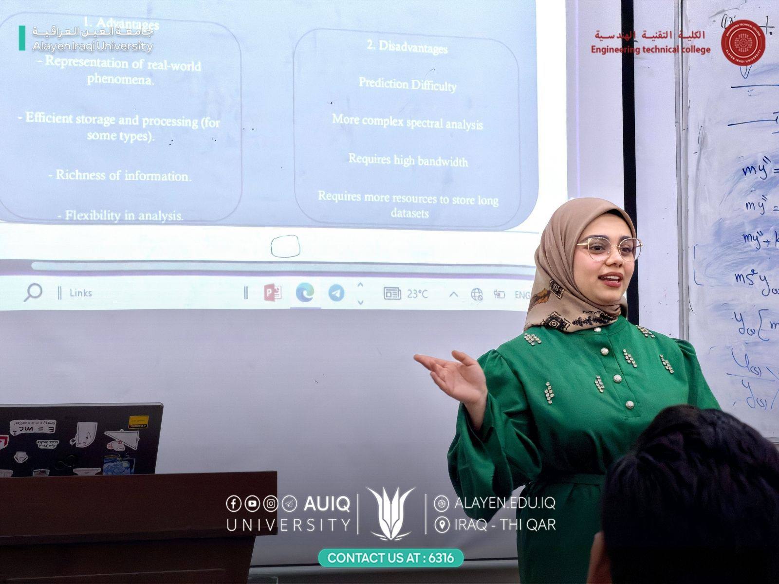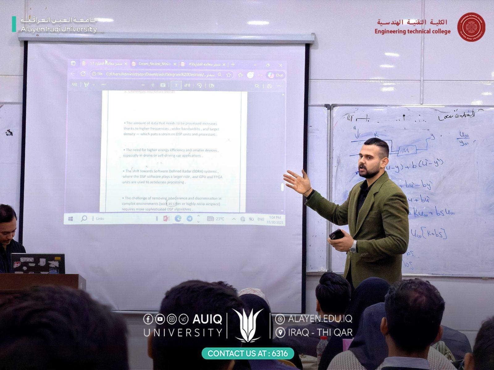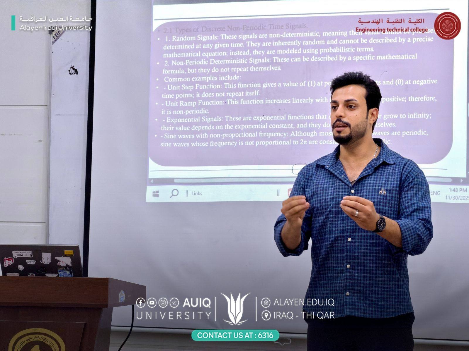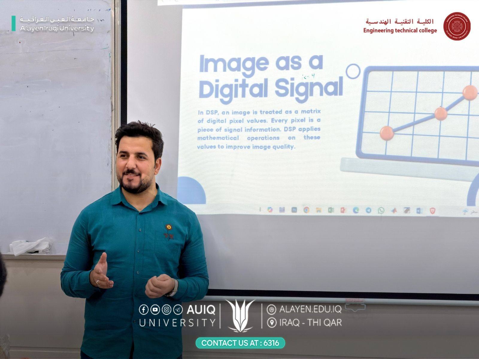 قدّم طلبة المرحلة الثالثة في قسم هندسة تقنيات الحاسوب جانباً من مشاركاتهم ضمن مادة معالجة الإشارة الرقمية (DSP)، وذلك من خلال شرح المفاهيم الأساسية للمادة وتقديم عروض توضيحية تناولت أهم المحاور النظرية المرتبطة بتحليل الإشارات، أنواع الفلاتر، وآليات تحويل الإشارات الرقمية.