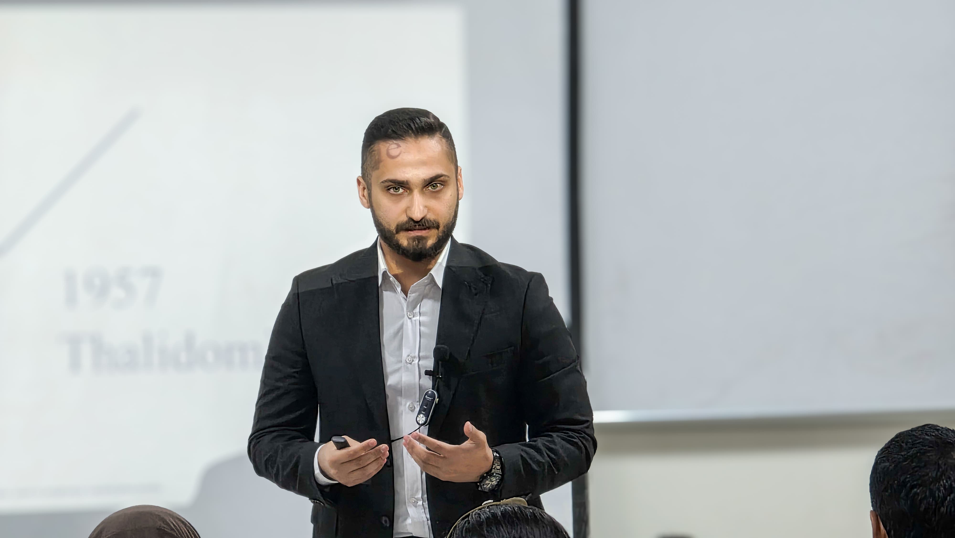 المحاضر بالورشة الدكتور الصيدلاني احمد طالب، شعبة اليقظة الدوائية في دائرة صحة ذي قار.