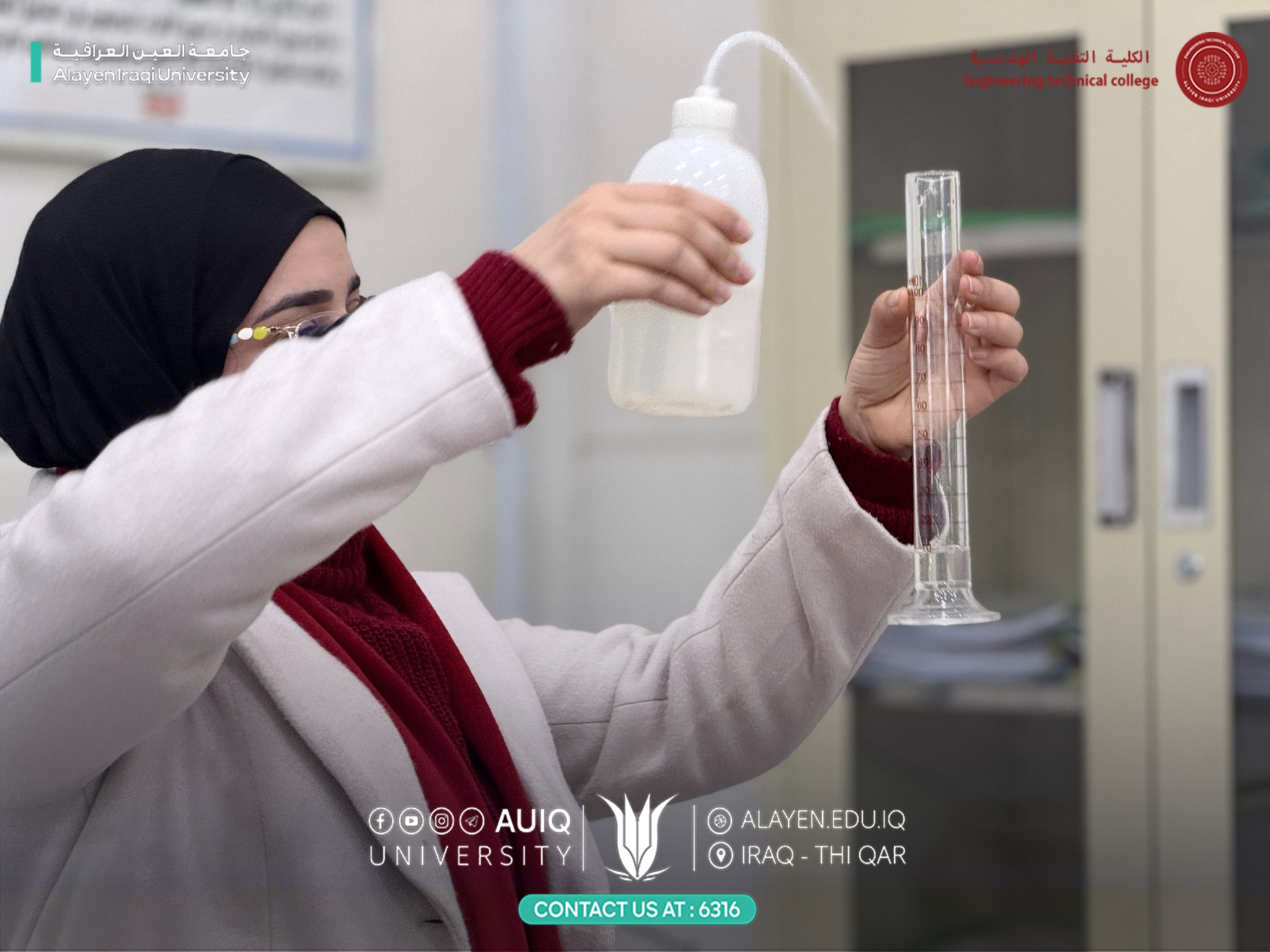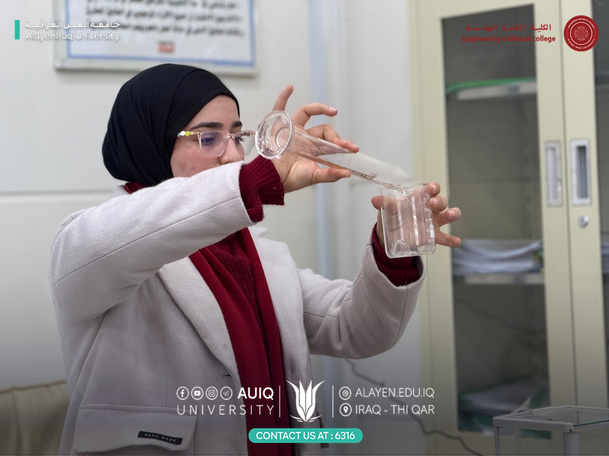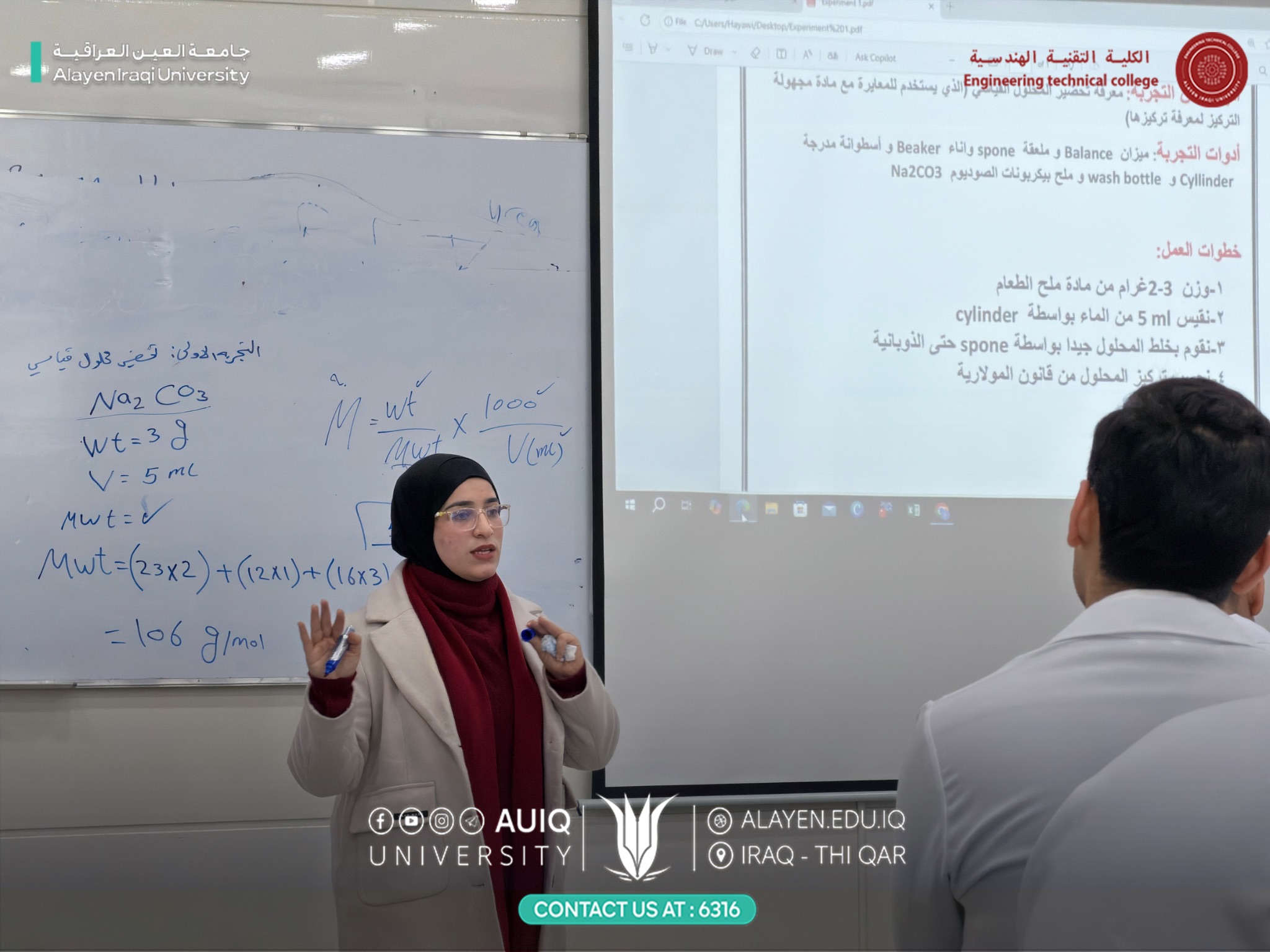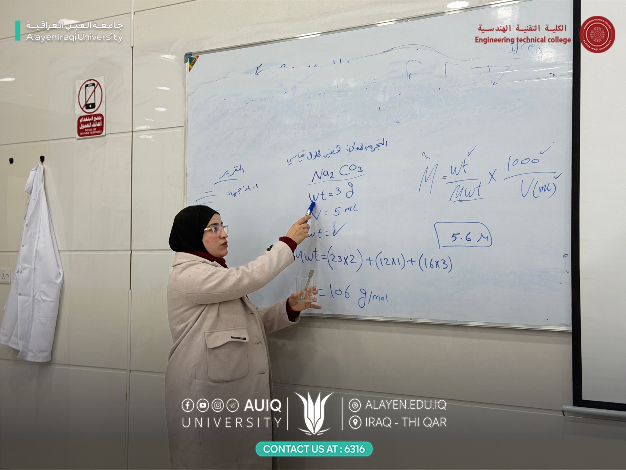 وتضمنت التجربة شرحًا عمليًا مفصلًا لخطوات تحضير المحلول القياسي، قدّمته معيد المادة م.ب. عهود جواد، حيث جرى توضيح آلية الوزن الدقيق، الإذابة، استخدام الدورق الحجمي، وأهمية ضبط التركيز للحصول على نتائج تحليلية دقيقة، مع التأكيد على قواعد السلامة والعمل المختبري الصحيح.