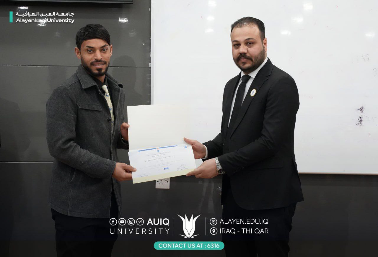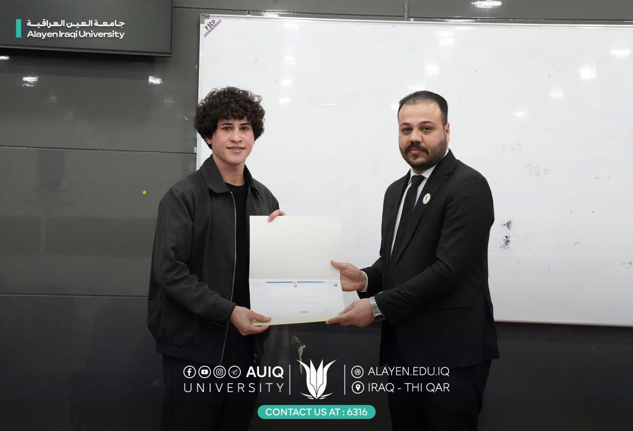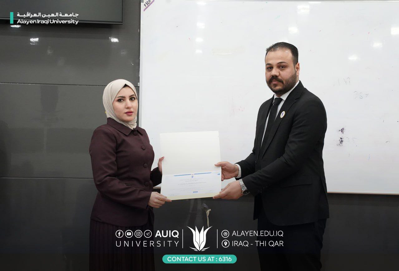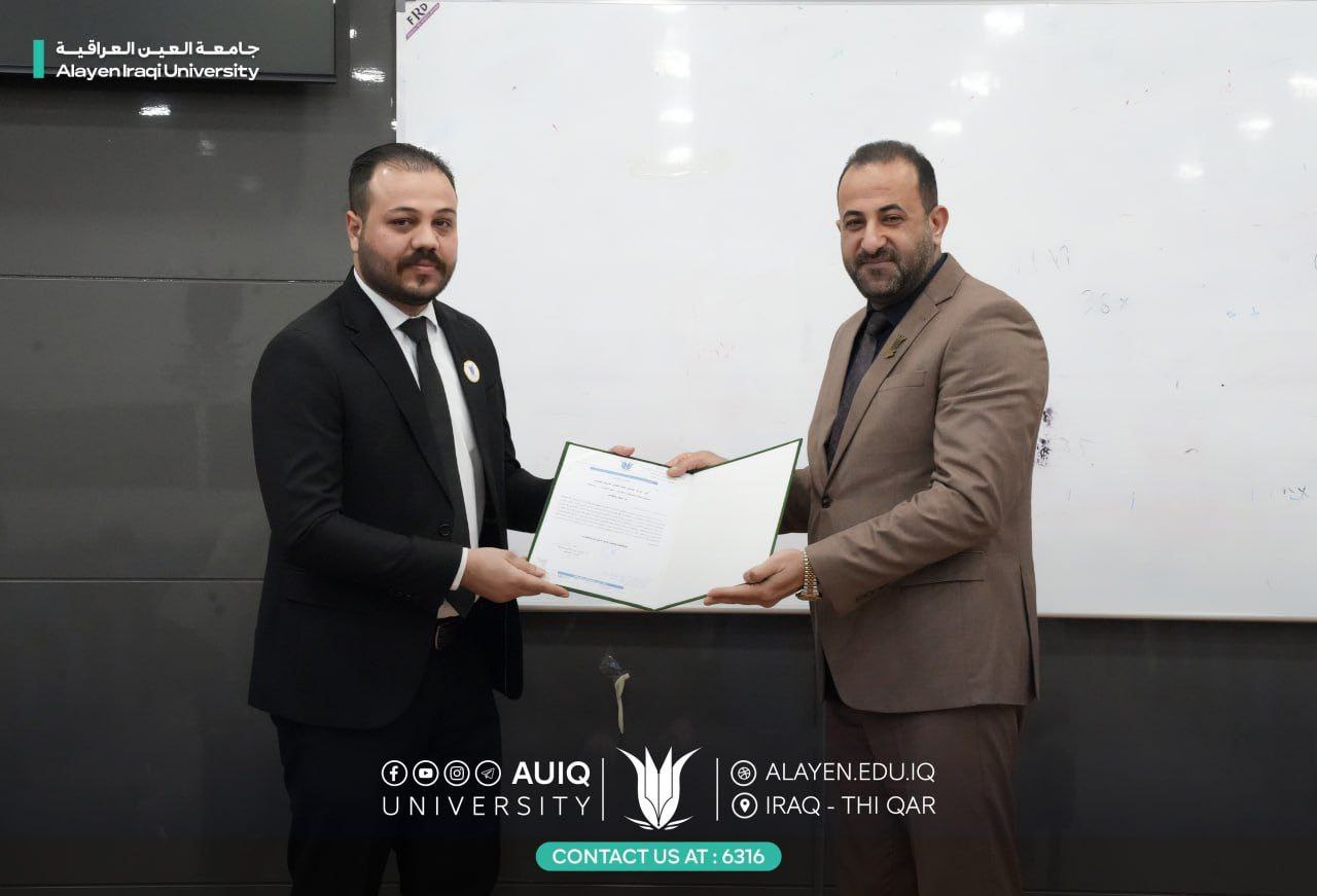 وجاء ذلك خلال حفل أقامته رئاسة الجامعة، بحضور رئيس جامعة العين العراقية الأستاذ الدكتور حيدر عبد الأمير مرهون، ومساعده للشؤون العلمية الأستاذ الدكتور نصير علي حسين، إلى جانب عدد من رؤساء الأقسام والتدريسيين والطلبة.