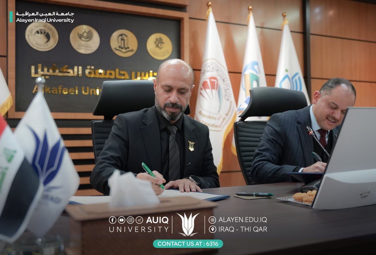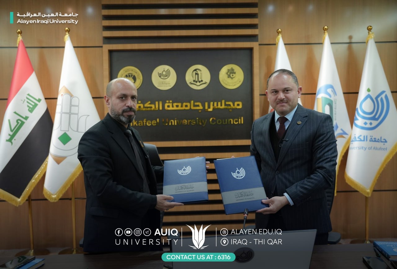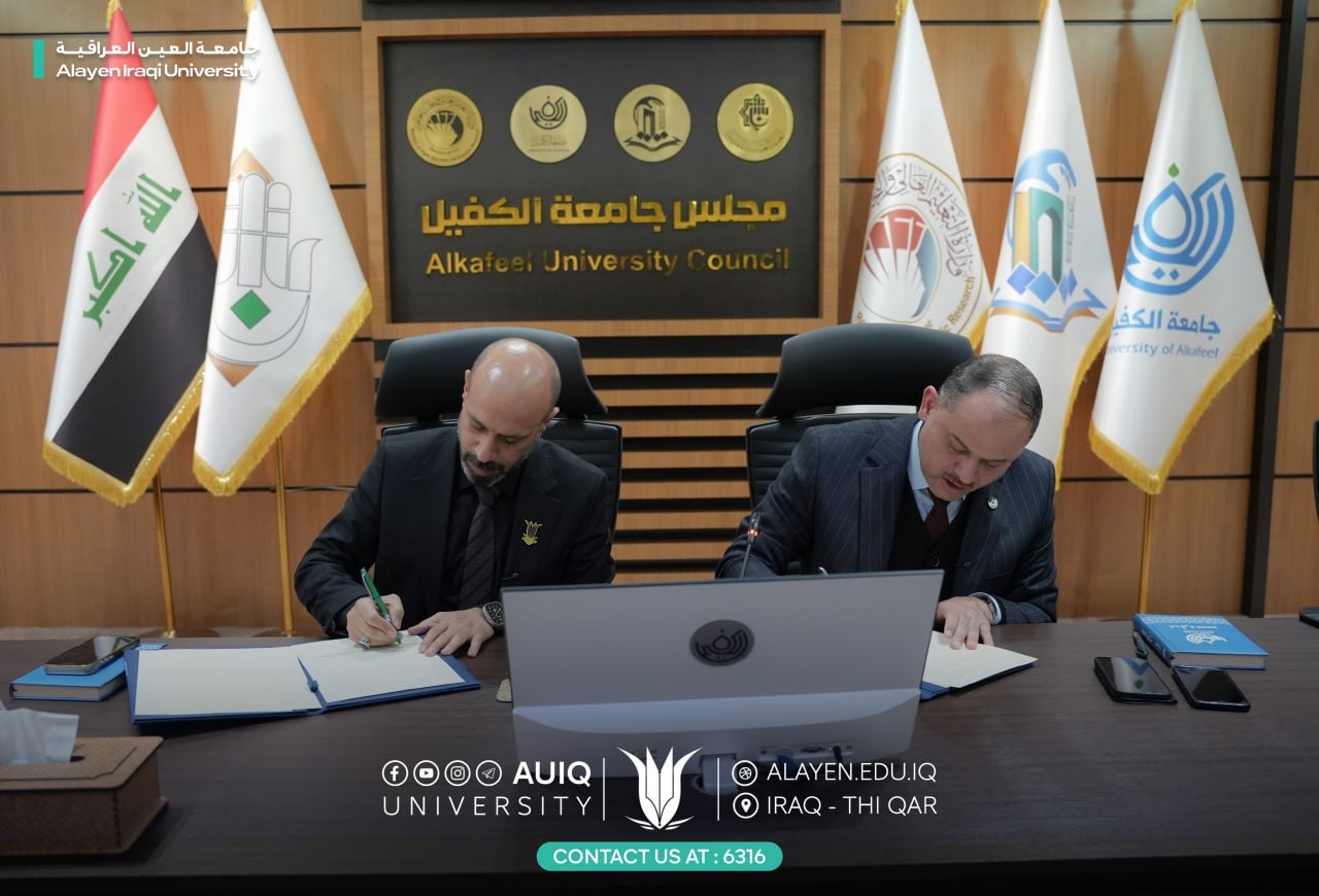 وقع رئيس الجامعة الأستاذ الدكتور حيدر عبد الأمير مرهون اتفاقية تعاون علمي مشترك مع جامعة الكفيل المتمثلة برئيس جامعة الكفيل الأستاذ الدكتور نورس محمد شهيد الدهان وبحضور مساعدي رئيسي الجامعتين للشؤون العلمية واعضاء مجلس جامعة العين العراقية ومجلس جامعة الكفيل.
