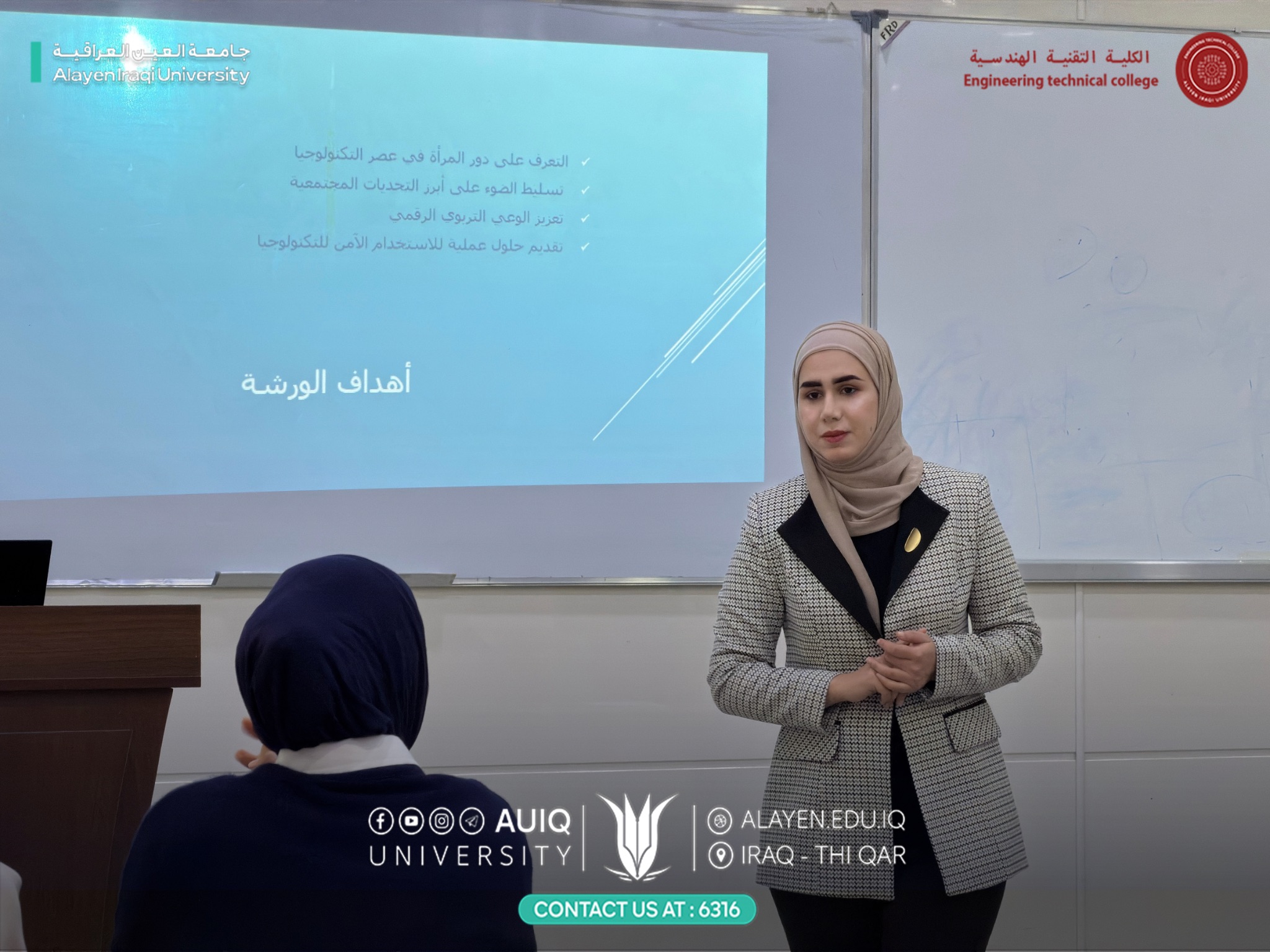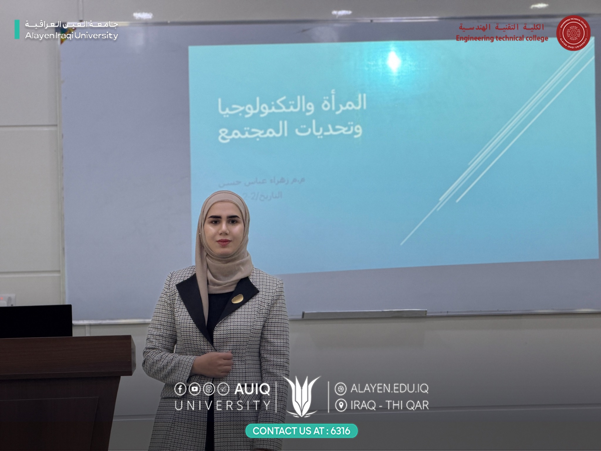وقد ألقت الورشة م.م. زهراء عباس، حيث تناولت فيها محاور عدة ركزت على العلاقة بين المرأة والتكنولوجيا الحديثة، والتحديات الاجتماعية التي تواجهها، إلى جانب تسليط الضوء على أهمية توظيف التقنيات المعاصرة في تطوير القدرات العلمية والعملية للمرأة، ودورها في تحقيق التنمية المستدامة داخل المجتمع.