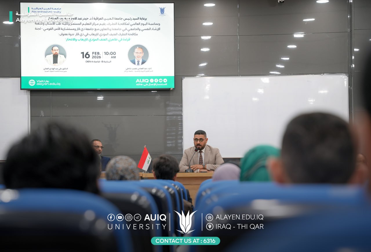 نظم مركز التعليم المستمر في جامعة العين العراقية، بالتعاون مع كلية طب الأسنان وشعبة الإرشاد النفسي والتوجيه التربوي وبالتنسيق مع جامعة ذي قار واللجنة الفرعية لمكافحة التطرف العنيف التابعة لمستشارية الأمن القومي، ندوة علمية تخصصية بعنوان "قراءة في ظاهرتي العنف المؤدي إلى الإرهاب والانتحار"، وذلك على قاعة المؤتمرات في البناية (B) في الجامعة.