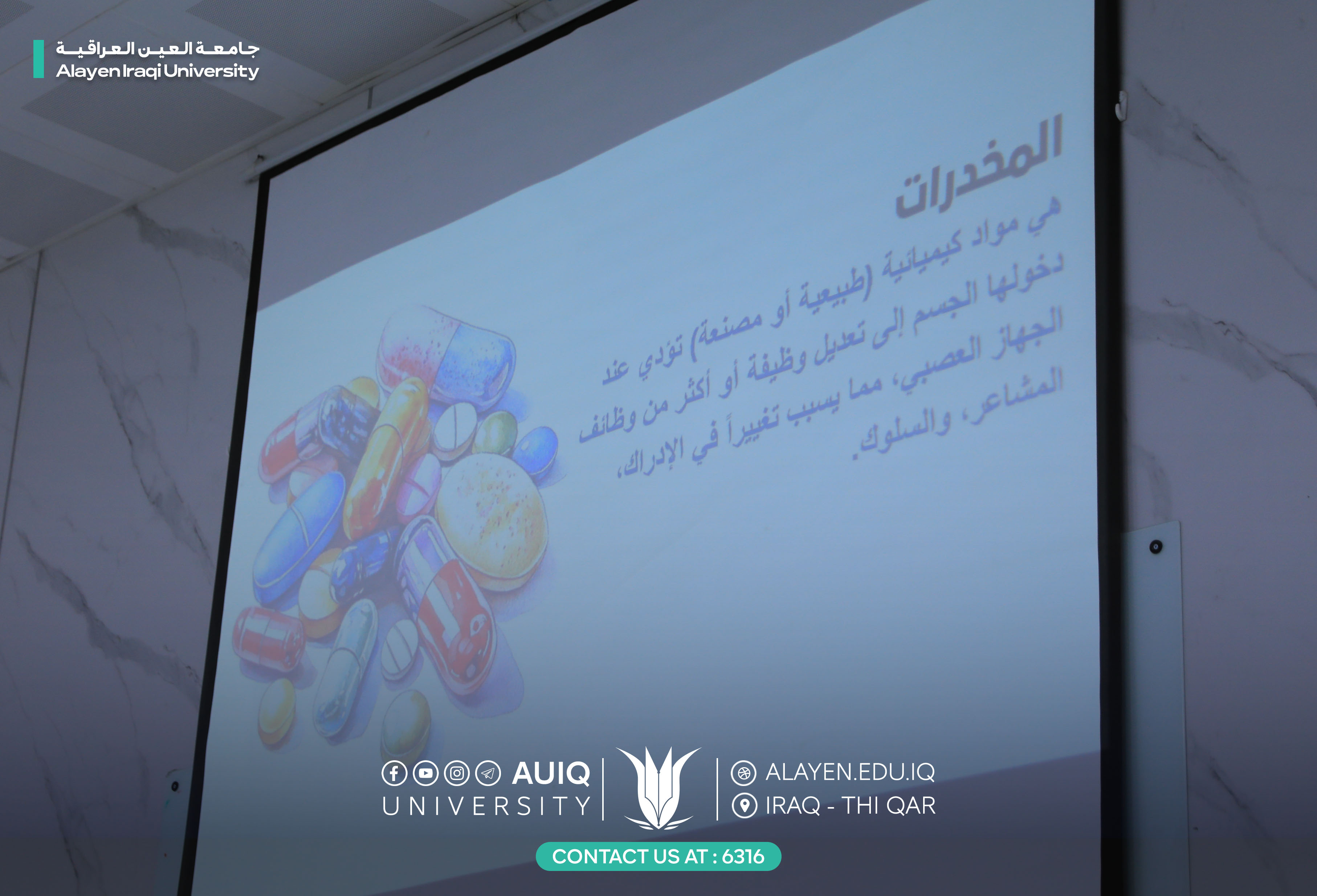 نظّمت وحدة الإرشاد النفسي الجامعي في كلية التقنيات الصحية والطبية – جامعة العين العراقية ورشة توعوية بعنوان "الحصانة النفسية ضد آفة المخدرات"، حاضر فيها مسؤول إعلام الكلية نور ضياء طالب ، بحضور عدد من تدريسيي وطلبة الكلية.