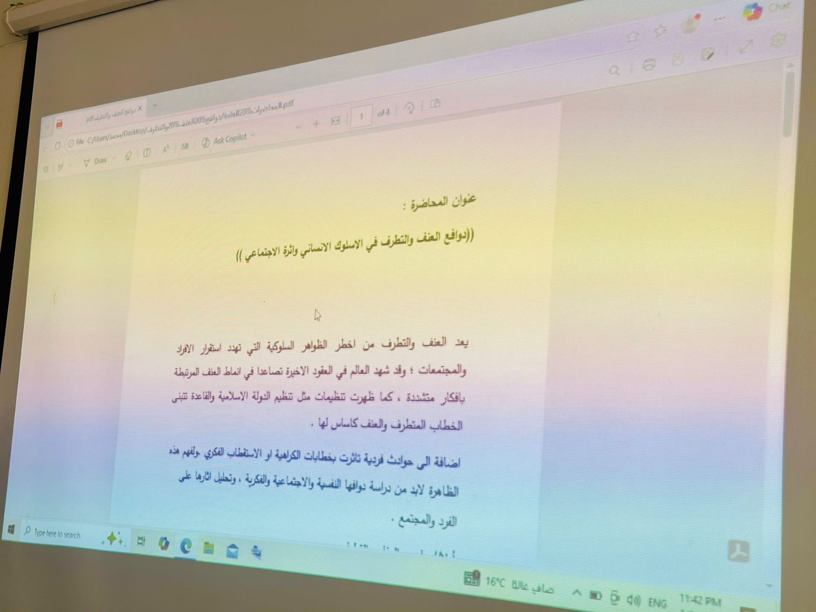 كما تطرقت المحاضرة إلى السبل الكفيلة بمعالجة ظاهرة التطرف والعنف، من خلال دور الجامعة في التوعية والتثقيف، إلى جانب دور المجتمع في تعزيز قيم الاعتدال والتسامح ونبذ العنف، بما يسهم في بناء بيئة آمنة ومستقرة فكريًا واجتماعيًا.