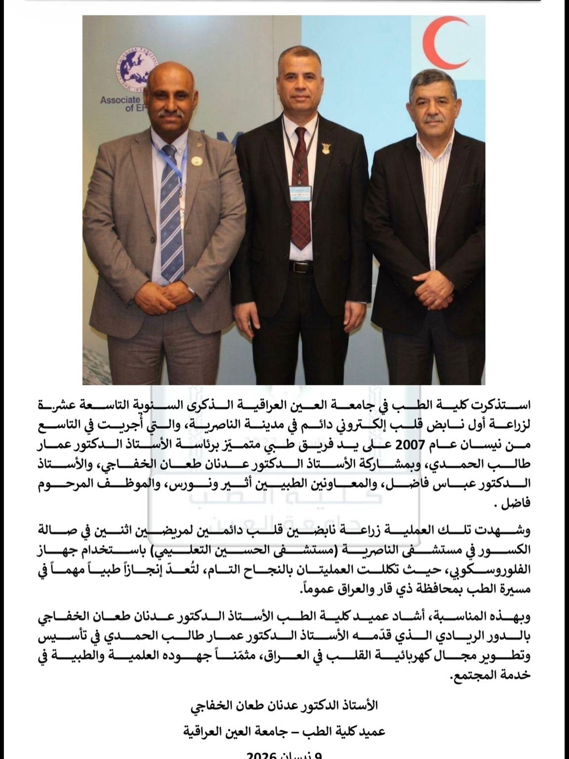 استذكرت كلية الطب في جامعة العين العراقية الذكرى السنوية التاسعة عشرة لإنجاز طبي رائد تمثل بإجراء أول عملية لزراعة ناظم قلب إلكتروني دائم في مدينة الناصرية بتاريخ 9 نيسان 2007، والتي نُفذت على يد فريق طبي متميز برئاسة الأستاذ الدكتور عمار طالب الحمدي، وبمشاركة نخبة من الأطباء، من بينهم الأستاذ الدكتور عدنان طعان الخفاجي والأستاذ الدكتور عباس فاضل، إلى جانب الكوادر الطبية الساندة.
