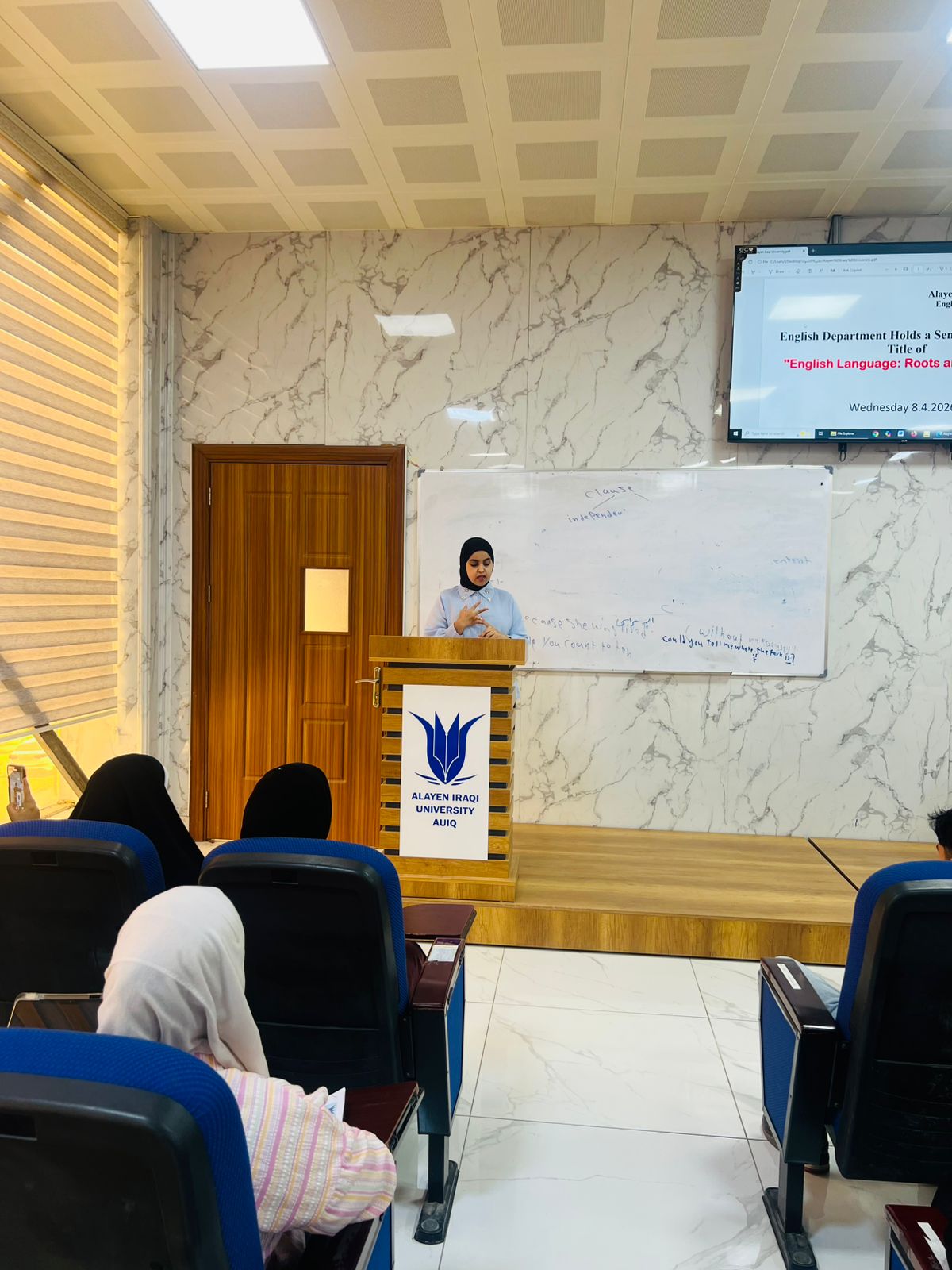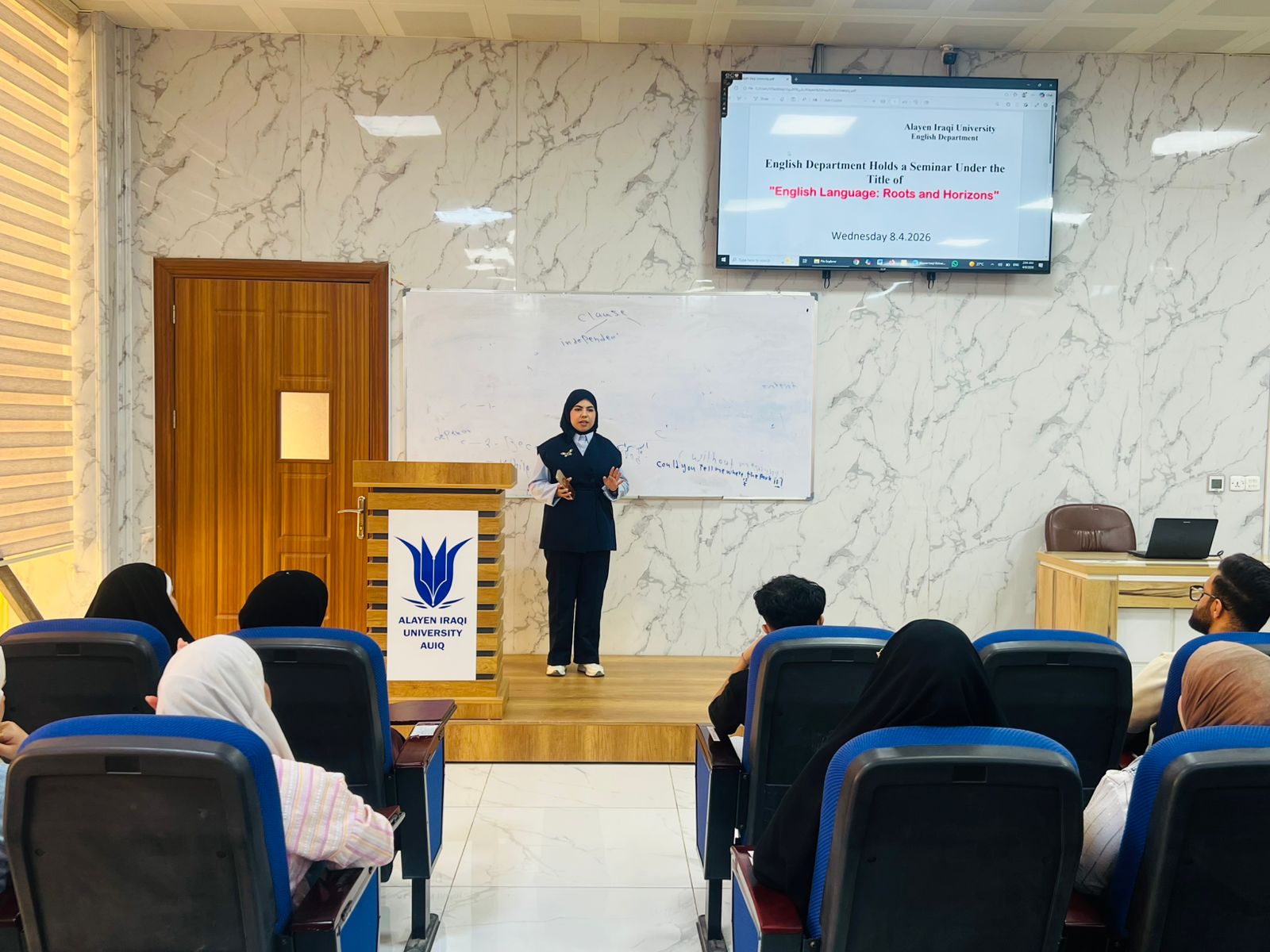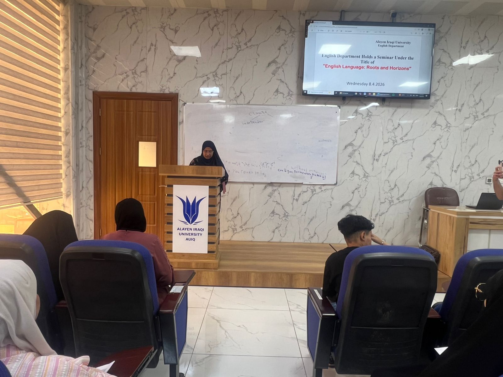 نظمت وحدة الشؤون الطلابية بالتعاون مع قسم اللغة الانكليزية في كلية التربية/ جامعة العين العراقية، يوم الأربعاء الموافق 8/4/2026، ندوة علمية بعنوان "اللغة الانكليزية: جذورها و آفاقها".