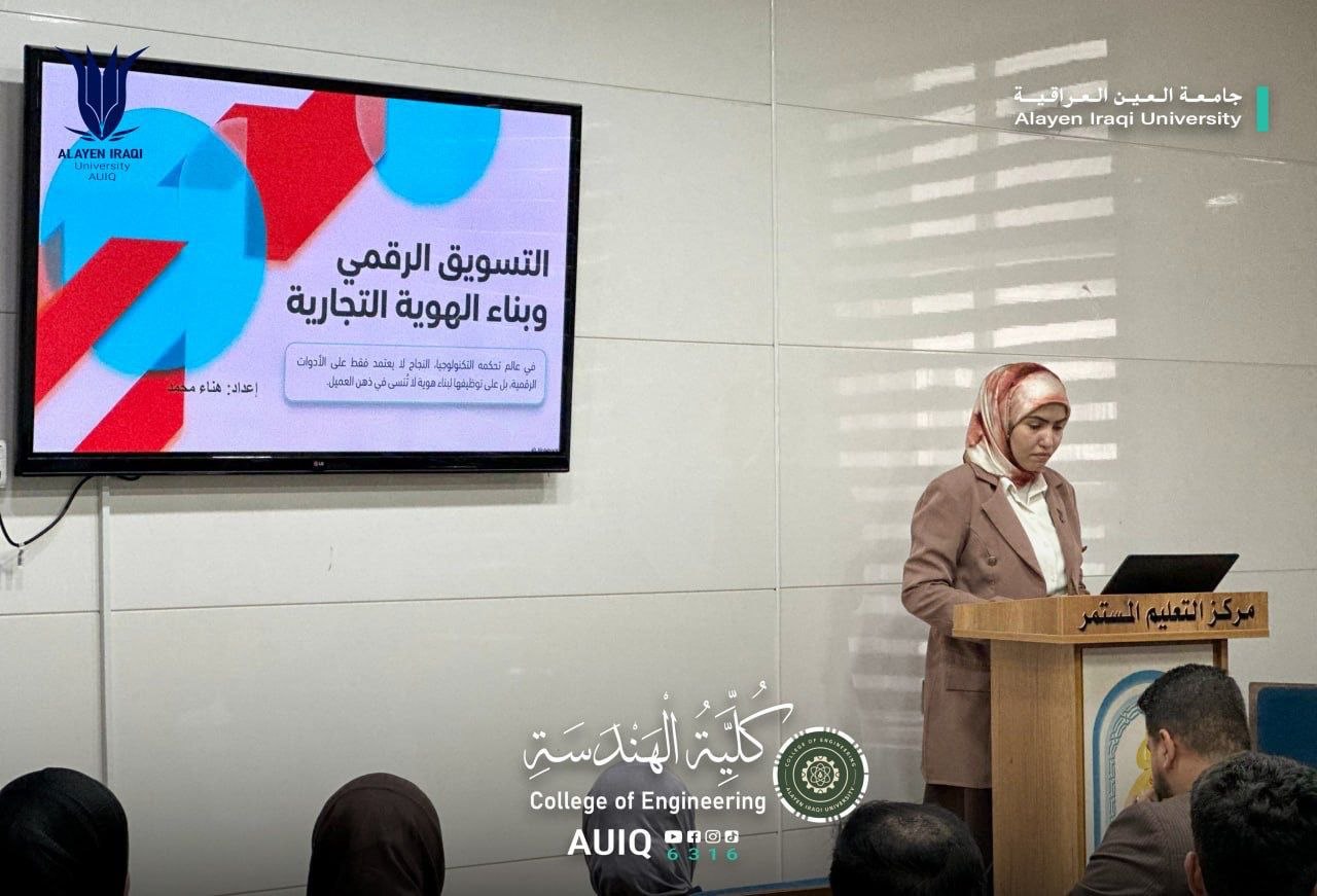 نظّمت كلية الهندسة في جامعة العين العراقية، بالتعاون مع مركز التعليم المستمر، ورشة تدريبية بعنوان “التسويق الرقمي وبناء الهوية التجارية”، قدّمتها م.م هناء محمد، بمشاركة عدد من طلبة الكلية.