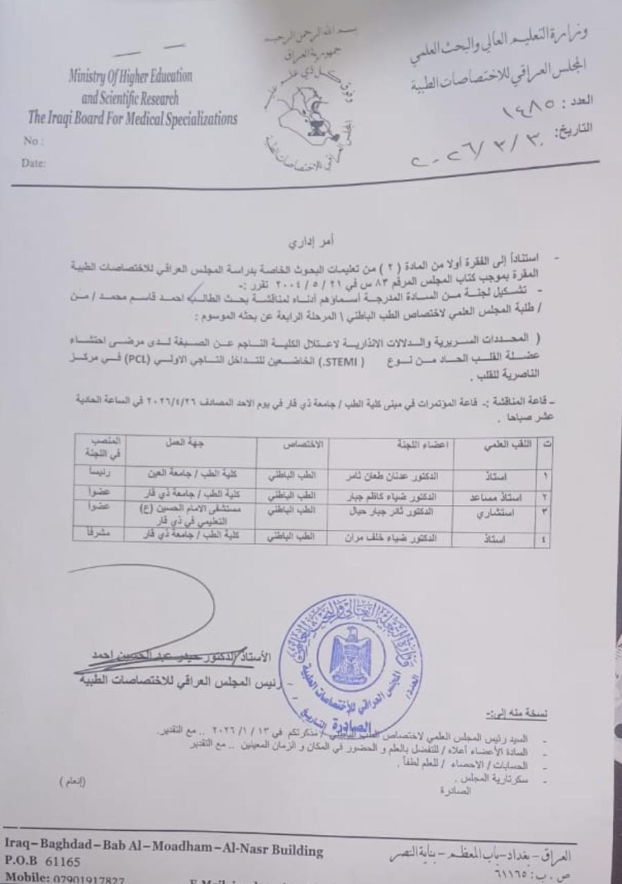 أصدر المجلس العراقي للاختصاصات الطبية أمرًا إداريًا يقضي بتشكيل لجنة علمية لمناقشة بحث تخصصي ضمن اختصاص الطب الباطني، برعاية وزارة التعليم العالي والبحث العلمي، وذلك في إطار دعم النشاط الأكاديمي وتعزيز جودة البحوث الطبية.