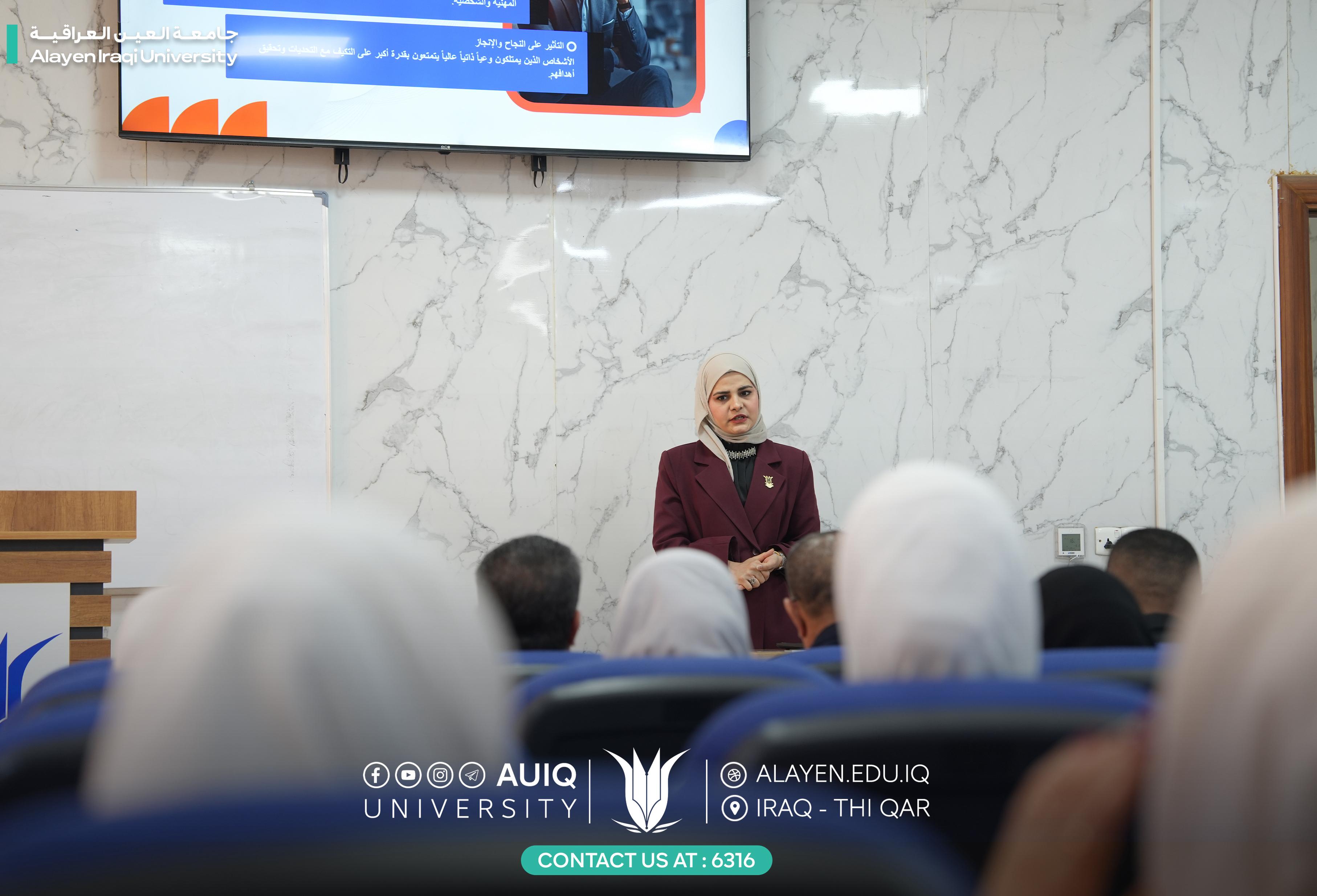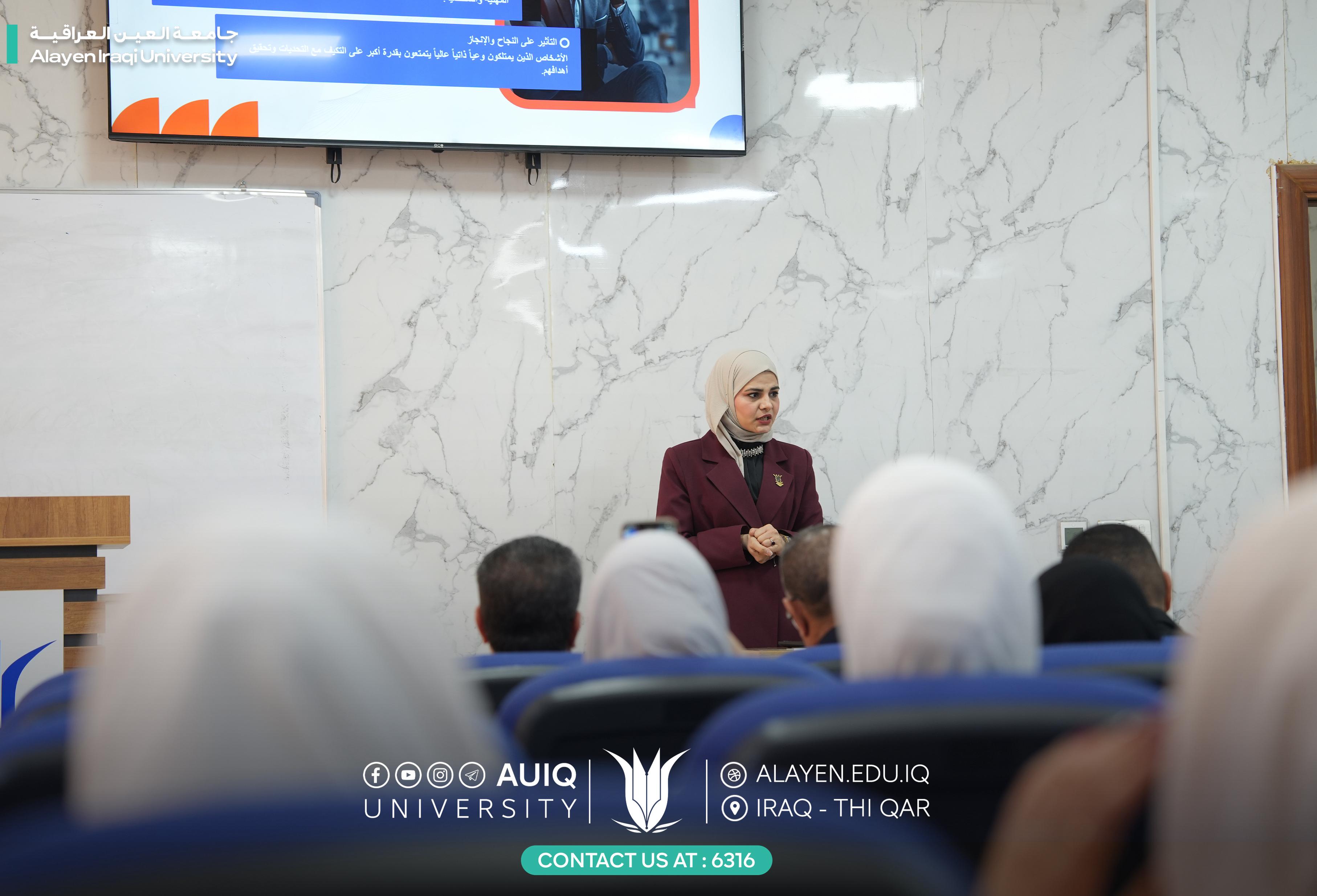 تقييم شعبة الإرشاد النفسي الجامعي في جامعة العين العراقية دورة تدريبية بعنوان “اكتشف ذاتك وحدد أهدافك”، ألقاها مسؤولة الشعبة م.م سرى محمد عبد الخضر صلال، وبحضور مدير مركز التعليم المستمر الأستاذ عبد الرحمن البطاط، وبمشاركة عدد من الطلبة والتدريسيين.